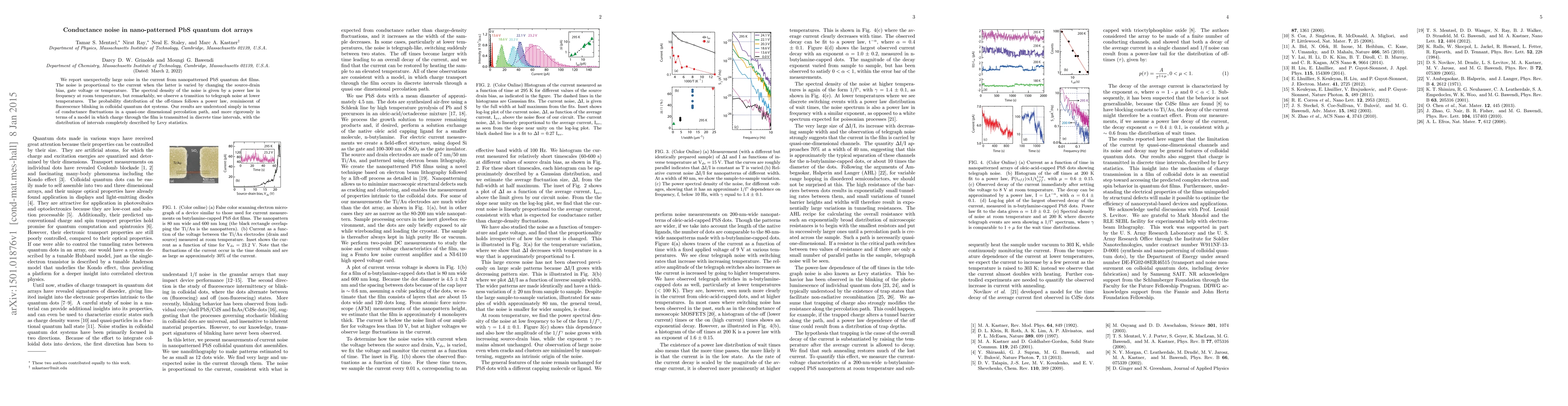 We report unexpectedly large noise in the current from nanopatterned PbS quantum dot films. The noise is proportional to the current when the latter is varied by changing the source-drain bias, gate voltage or temperature. The spectral density of the noise is given by a power law in frequency at room temperature, but remarkably, we observe a transition to telegraph noise at lower temperatures. The probability distribution of the off-times follows a power law, reminiscent of fluorescence blinking in colloidal quantum dot systems. Our results are understood simply in terms of conductance fluctuations in a quasi-one dimensional percolation path, and more rigorously in terms of a model in which charge through the film is transmitted in discrete time intervals, with the distribution of intervals completely described by Levy statistics.