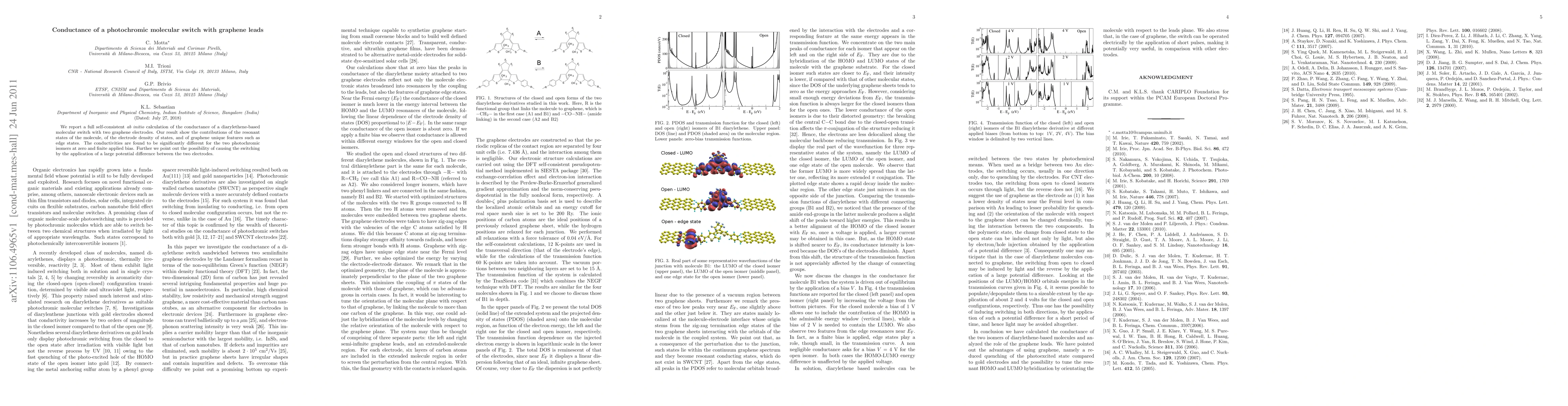 This study uses ab initio calculations to analyze the conductance of a diarylethene-based photochromic molecular switch connected to graphene electrodes, revealing distinct conductivities for its two isomers and the influence of graphene's edge states, with potential for switching via a large applied potential difference.