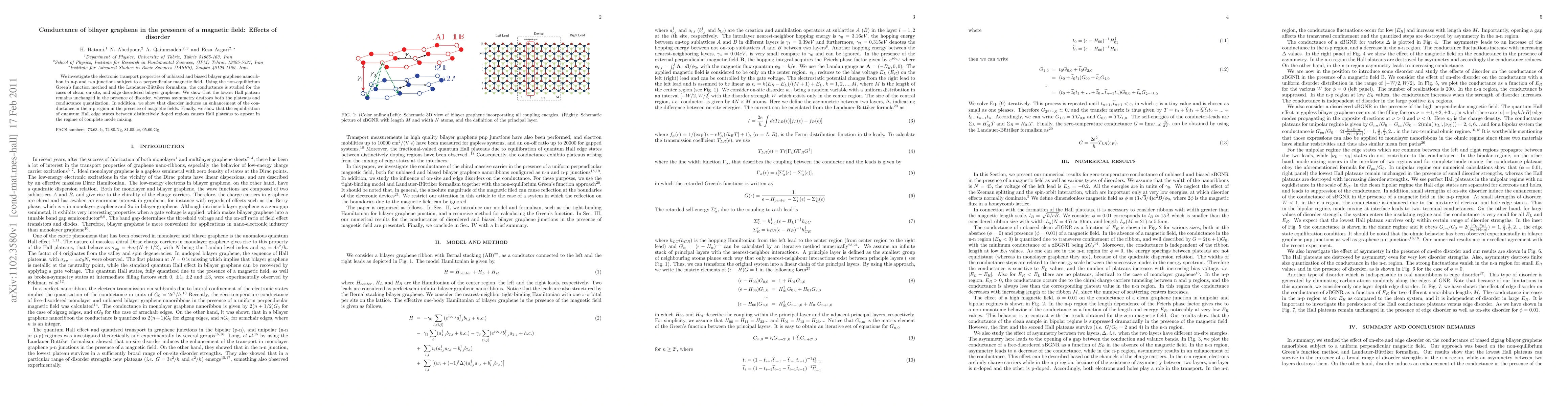 This paper studies the electronic transport in bilayer graphene nanoribbons under magnetic fields, revealing that disorder impacts conductance quantization but preserves the lowest Hall plateau. Disorder enhances conductance in n-p regions and can induce Hall plateaus in fully mixed quantum states.