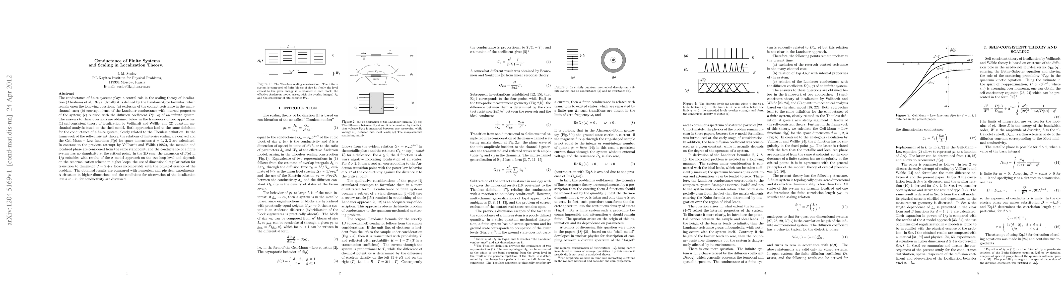 The conductance of finite systems plays a central role in the scaling theory of localization (Abrahams et al, 1979). Usually it is defined by the Landauer-type formulas, which remain open the following questions: (a) exclusion of the contact resistance in the many-channel case; (b) correspondence of the Landauer conductance with internal properties of the system; (c) relation with the diffusion coefficient D(\omega,q) of an infinite system. The answers to these questions are obtained below in the framework of two approaches: (1) self-consistent theory of localization by Vollhardt and Woelfle, and (2) quantum mechanical analysis based on the shell model. Both approaches lead to the same definition for the conductance of a finite system, closely related to the Thouless definition. In the framework of the self-consistent theory, the relations of finite-size scaling are derived and the Gell-Mann - Low functions \beta(g) for space dimensions d=1,2,3 are calculated. In contrast to the previous attempt by Vollhardt and Woelfle (1982), the metallic and localized phase are considered from the same standpoint, and the conductance of a finite system has no singularity at the critical point. In the 2D case, the expansion of \beta(g) in 1/g coincides with results of the \sigma-model approach on the two-loop level and depends on the renormalization scheme in higher loops; the use of dimensional regularization for transition to dimension d=2+\epsilon looks incompatible with the physical essence of the problem. The obtained results are compared with numerical and physical experiments. A situation in higher dimensions and the conditions for observation of the localization law \sigma\propto -i\omega for conductivity are discussed.
