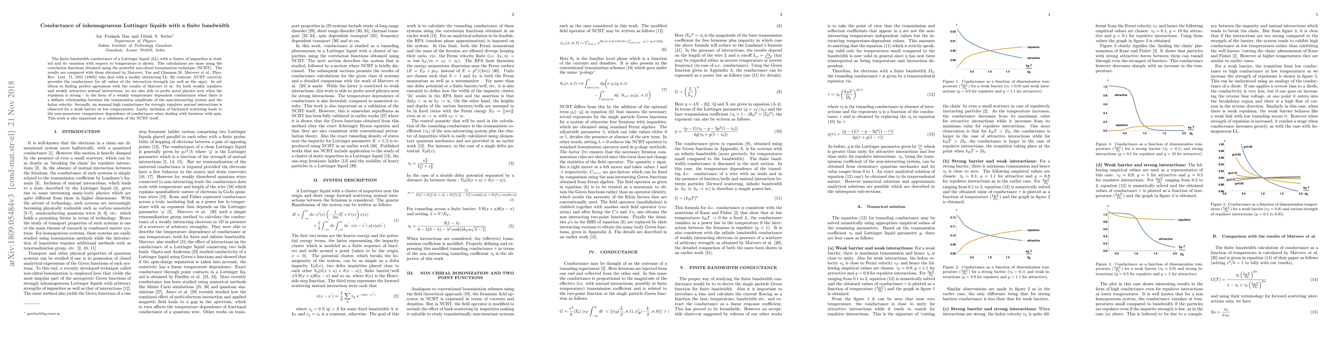 The finite-bandwidth conductance of a Luttinger liquid (LL) with a cluster of impurities is studied and its variation with respect to temperature is shown. The calculations are done using the correlation functions obtained using the powerful non-chiral bosonization technique (NCBT) . The results are compared with those obtained by Matveev, Yue and Glazman [K. Matveev et al., Phys. Rev. Lett. 71, 3351 (1993)] who deal with a weakly interacting LL. By contrast, NCBT correctly provides the conductance for all values of the interaction strength (as well as the sign). In addition to finding perfect agreement with the results of Matveev et al. for both weakly repulsive and weakly attractive mutual interactions, we are also able to probe novel physics seen when the repulsion is strong - in the form of a weakly temperature dependent conductance when there is a definite relationship between the transmission amplitude of the non-interacting system and the holon velocity. Secondly, an unusual high conductance for strongly repulsive mutual interactions is observed for a weak barrier at low temperatures. Lastly, inclusion of backward scattering leads to the non-monotonic temperature dependence of conductance when dealing with fermions with spin. This work is also important as a validation of the NCBT itself.
