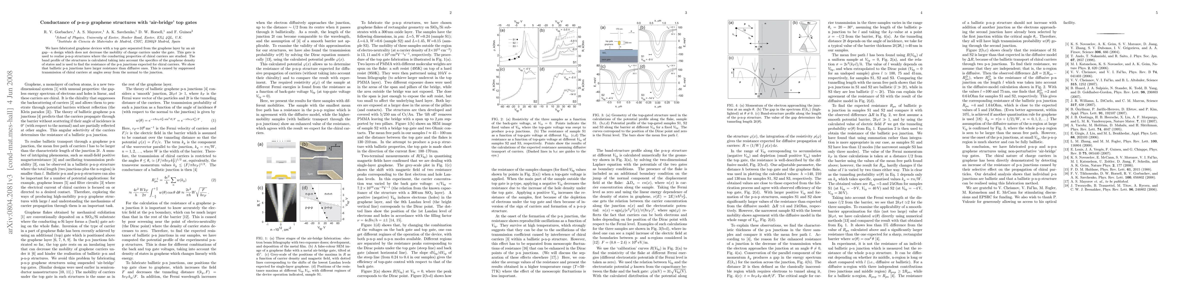 Summary: The study fabricates p-n-p graphene structures with top gates separated by an air gap, maintaining charge carrier mobility. It finds that ballistic p-n junctions exhibit higher resistance than diffusive ones due to suppressed transmission of chiral carriers at oblique angles.