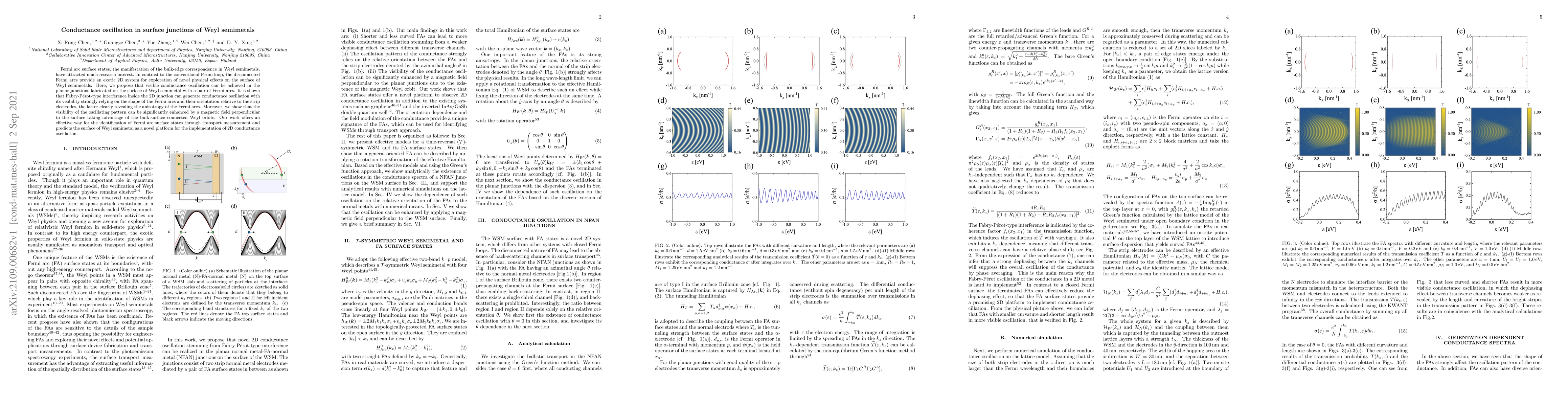 Research explores conductance oscillation in Weyl semimetal surface junctions, revealing that Fabry-Pérot interference generates oscillations dependent on Fermi arc shapes and orientations. Enhanced visibility of these oscillations is predicted under perpendicular magnetic fields, offering a novel platform for 2D conductance oscillation studies.