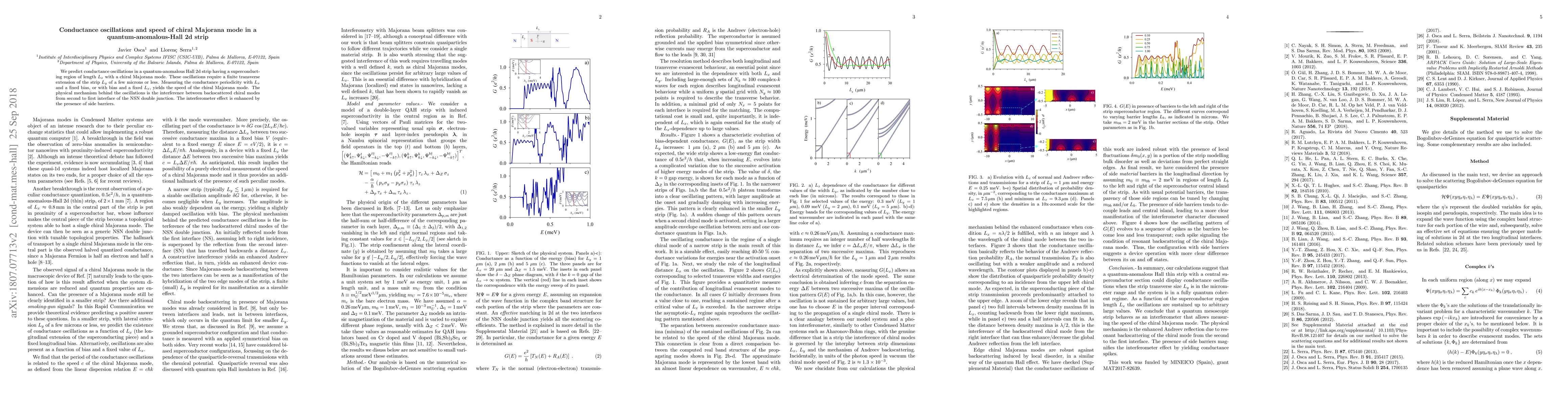Summary: This paper predicts conductance oscillations in quantum-anomalous Hall strips with superconducting regions, revealing the speed of chiral Majorana modes through interference effects. The oscillations depend on the strip's transverse extension and can be measured by varying the superconducting length or the bias.
