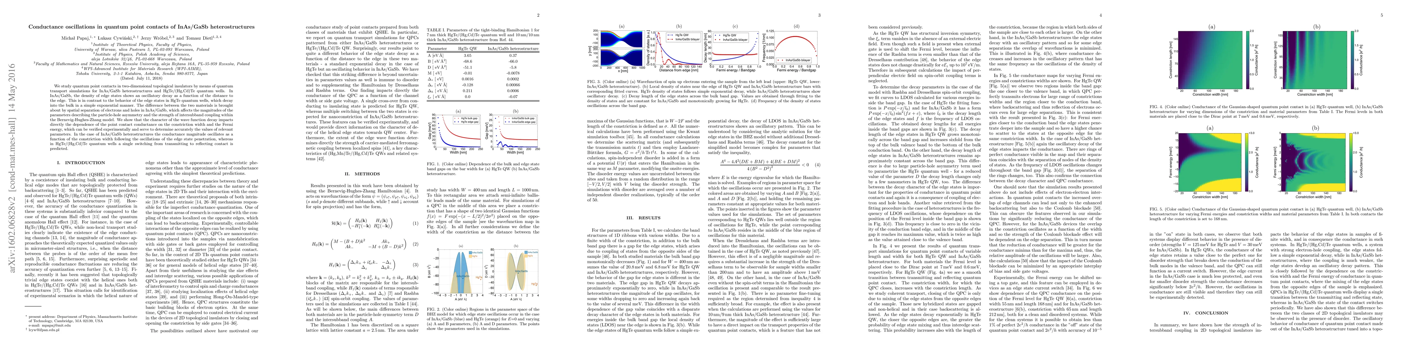 We study quantum point contacts in two-dimensional topological insulators by means of quantum transport simulations for InAs/GaSb heterostructures and HgTe/(Hg,Cd)Te quantum wells. In InAs/GaSb, the density of edge states shows an oscillatory decay as a function of the distance to the edge. This is in contrast to the behavior of the edge states in HgTe quantum wells, which decay into the bulk in a simple exponential manner. The difference between the two materials is brought about by spatial separation of electrons and holes in InAs/GaSb, which affects the magnitudes of the parameters describing the particle-hole asymmetry and the strength of intersubband coupling within the Bernevig-Hughes-Zhang model. We show that the character of the wave function decay impacts directly the dependence of the point contact conductance on the constriction width and the Fermi energy, which can be verified experimentally and serve to determine accurately the values of relevant parameters. In the case of InAs/GaSb heterostructures the conductance magnitude oscillates as a function of the constriction width following the oscillations of the edge state penetration, whereas in HgTe/(Hg,Cd)Te quantum wells a single switching from transmitting to reflecting contact is predicted.