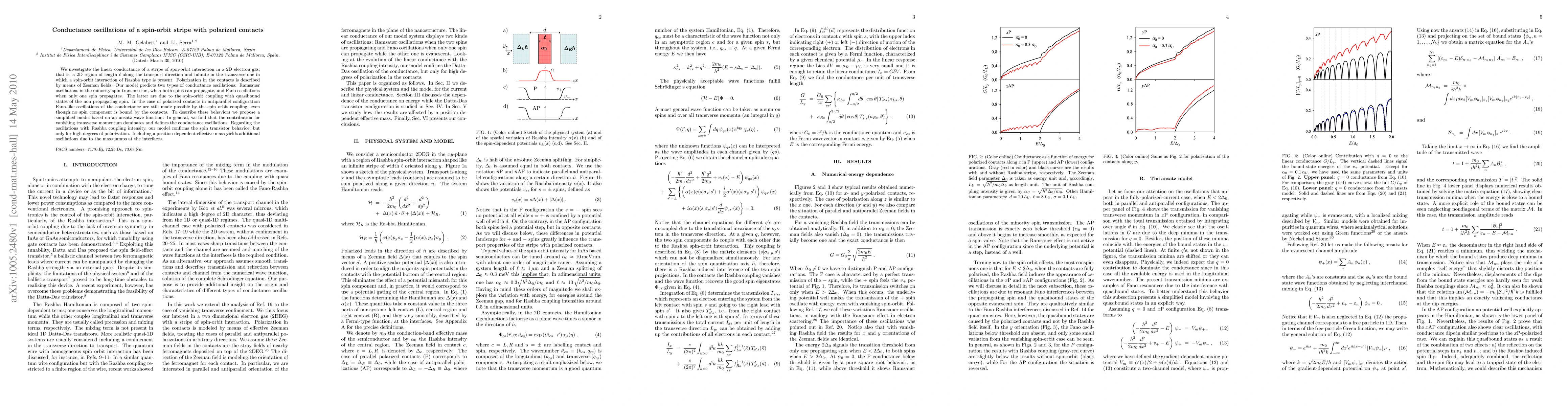 We investigate the linear conductance of a stripe of spin-orbit interaction in a 2D electron gas; that is, a 2D region of length $\ell$ along the transport direction and infinite in the transverse one in which a spin-orbit interaction of Rashba type is present. Polarization in the contacts is described by means of Zeeman fields. Our model predicts two types of conductance oscillations: Ramsauer oscillations in the minority spin transmission, when both spins can propagate, and Fano oscillations when only one spin propagates. The latter are due to the spin-orbit coupling with quasibound states of the non propagating spin. In the case of polarized contacts in antiparallel configuration Fano-like oscillations of the conductance are still made possible by the spin orbit coupling, even though no spin component is bound by the contacts. To describe these behaviors we propose a simplified model based on an ansatz wave function. In general, we find that the contribution for vanishing transverse momentum dominates and defines the conductance oscillations. Regarding the oscillations with Rashba coupling intensity, our model confirms the spin transistor behavior, but only for high degrees of polarization. Including a position dependent effective mass yields additional oscillations due to the mass jumps at the interfaces.