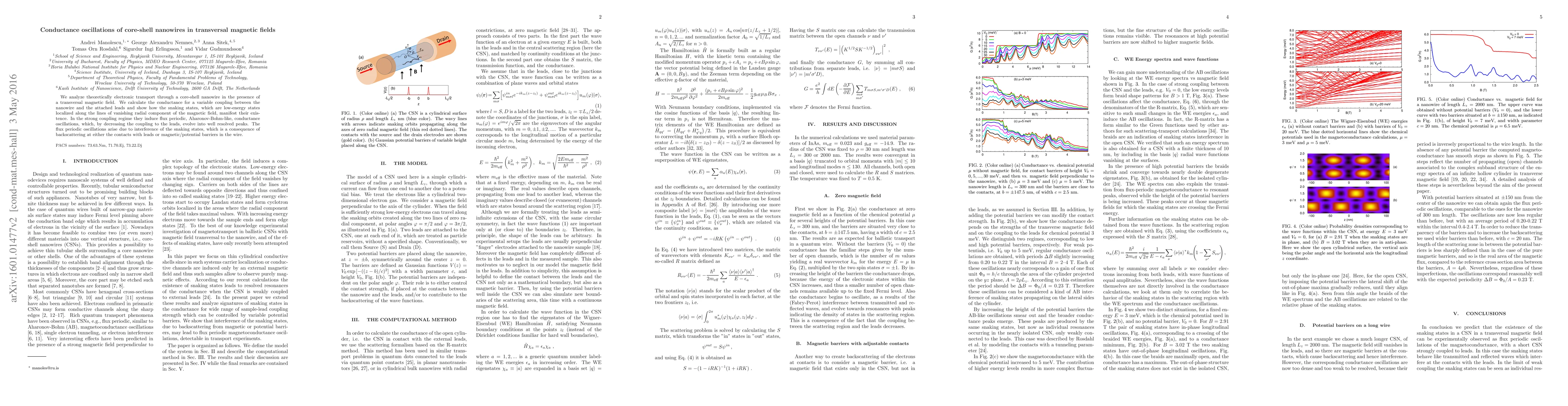This paper theoretically investigates electronic transport in core-shell nanowires under a transversal magnetic field, revealing conductance oscillations due to snaking states. Strong coupling induces Aharonov-Bohm-like oscillations, which transition to distinct peaks with reduced coupling, demonstrating the impact of snaking states on magnetoconductance.