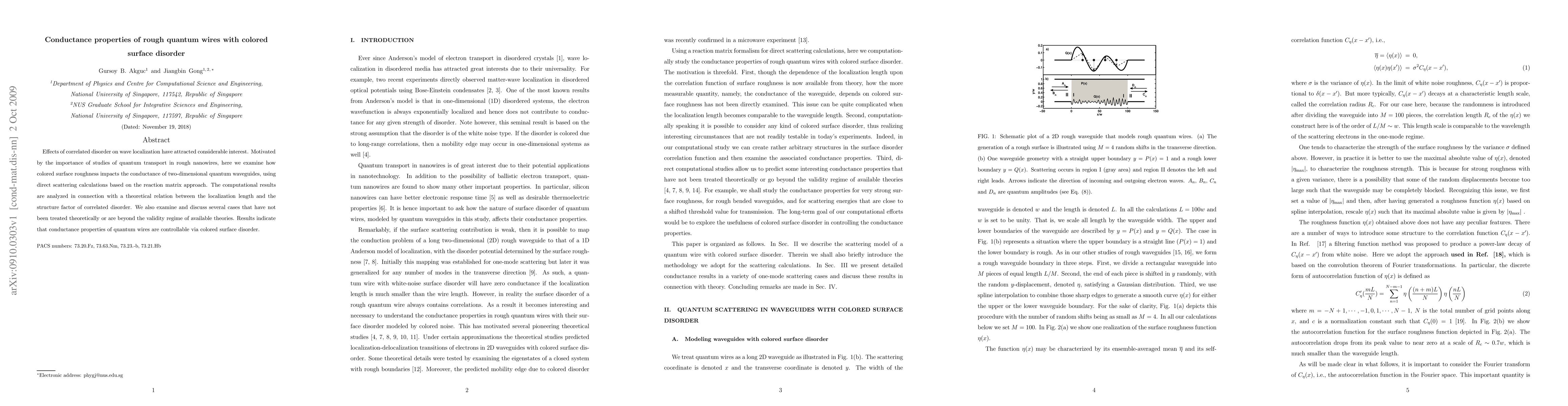 This paper investigates how colored surface roughness affects the conductance of two-dimensional quantum waveguides using direct scattering calculations. The findings suggest that the conductance properties of rough quantum wires can be controlled through the manipulation of correlated surface disorder.