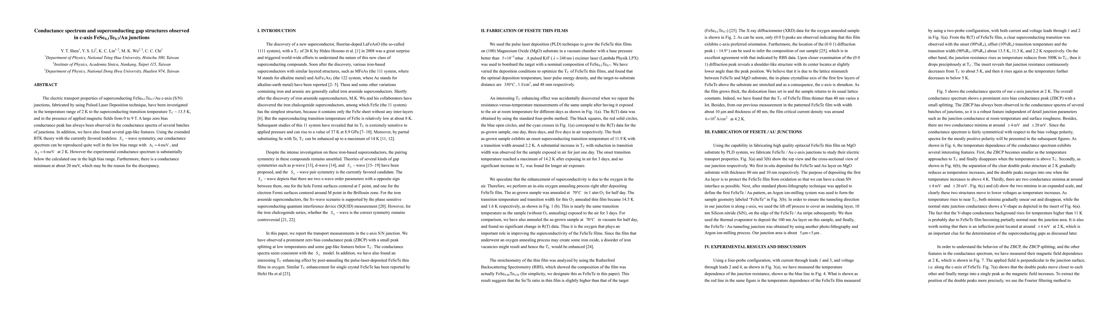 Researchers investigated FeSe0.3Te0.7/Au c-axis junctions, finding a large zero bias conductance peak and gap-like features in their conductance spectra, which can be explained by the extended BTK theory with a superconducting gap of 4-6 meV.