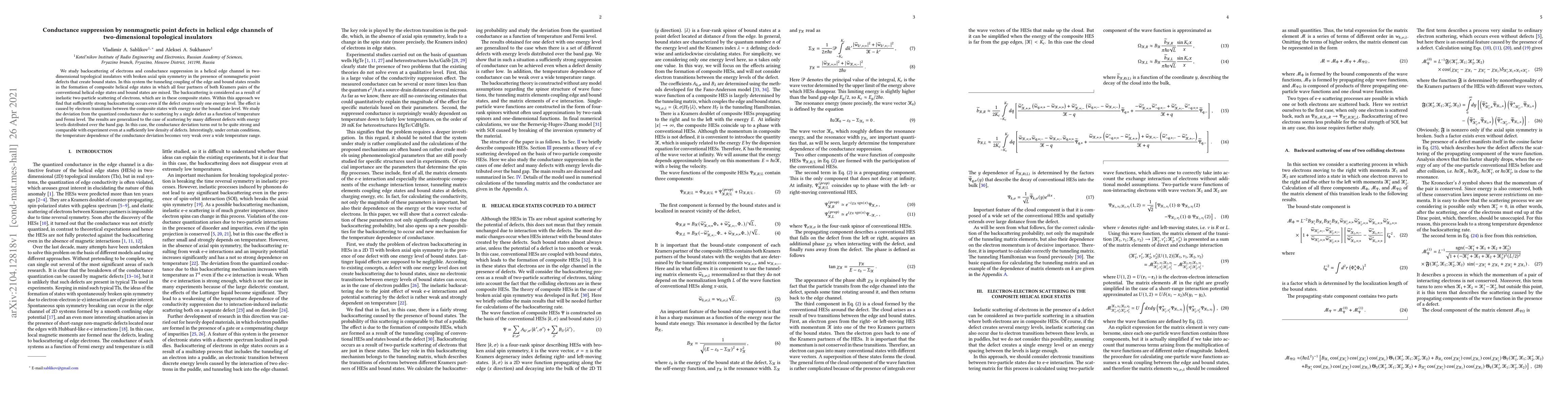 This paper investigates how nonmagnetic point defects in helical edge channels of two-dimensional topological insulators suppress conductance through backscattering, revealing that even a single defect can cause significant scattering due to electron transitions between composite states. The study finds that conductance deviation is strong even with a low defect density, and under specific conditions, the temperature dependence of conductance becomes negligible over a broad range.