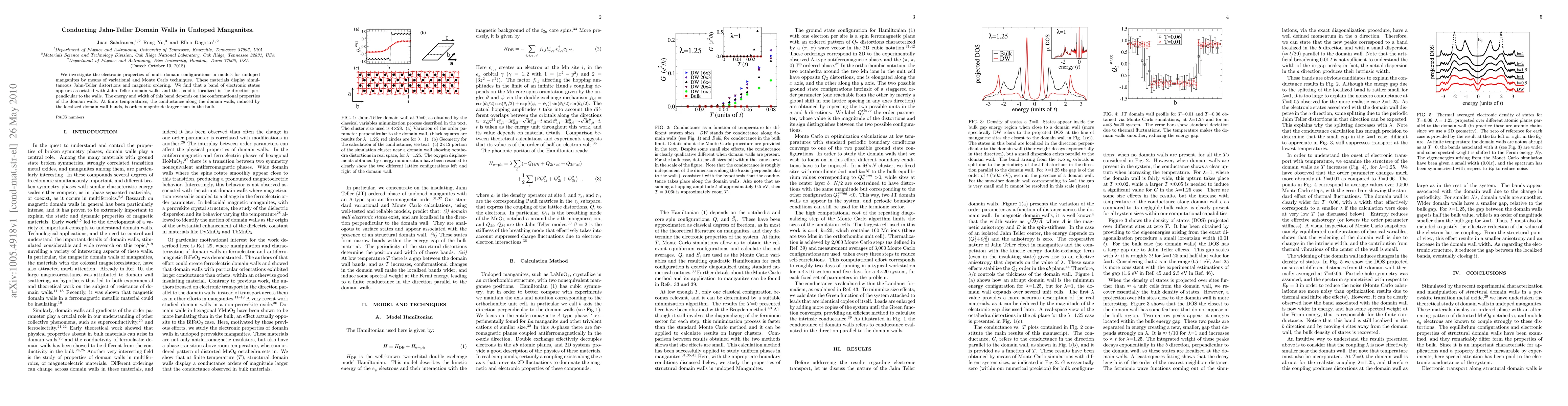 This paper investigates undoped manganites' electronic properties in multi-domain configurations, revealing a localized band of electronic states associated with Jahn-Teller domain walls. The conductance along these walls at finite temperatures is significantly higher than in the bulk, indicating enhanced conduction properties.