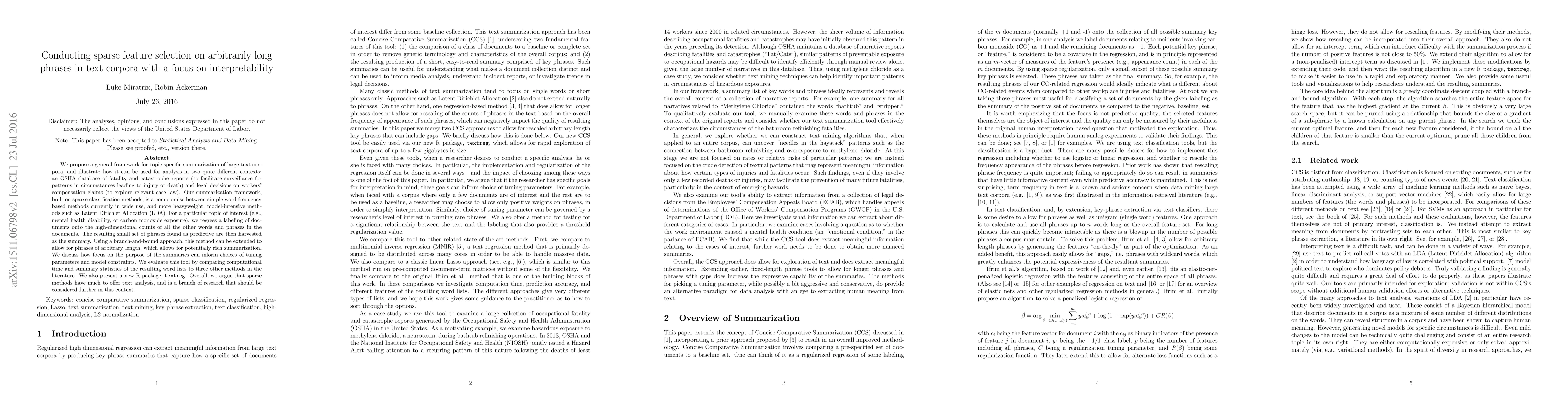 We propose a general framework for topic-specific summarization of large text corpora, and illustrate how it can be used for analysis in two quite different contexts: an OSHA database of fatality and catastrophe reports (to facilitate surveillance for patterns in circumstances leading to injury or death) and legal decisions on workers' compensation claims (to explore relevant case law). Our summarization framework, built on sparse classification methods, is a compromise between simple word frequency based methods currently in wide use, and more heavyweight, model-intensive methods such as Latent Dirichlet Allocation (LDA). For a particular topic of interest (e.g., mental health disability, or chemical reactions), we regress a labeling of documents onto the high-dimensional counts of all the other words and phrases in the documents. The resulting small set of phrases found as predictive are then harvested as the summary. Using a branch-and-bound approach, this method can be extended to allow for phrases of arbitrary length, which allows for potentially rich summarization. We discuss how focus on the purpose of the summaries can inform choices of regularization parameters and model constraints. We evaluate this tool by comparing computational time and summary statistics of the resulting word lists to three other methods in the literature. We also present a new R package, textreg. Overall, we argue that sparse methods have much to offer text analysis, and is a branch of research that should be considered further in this context.