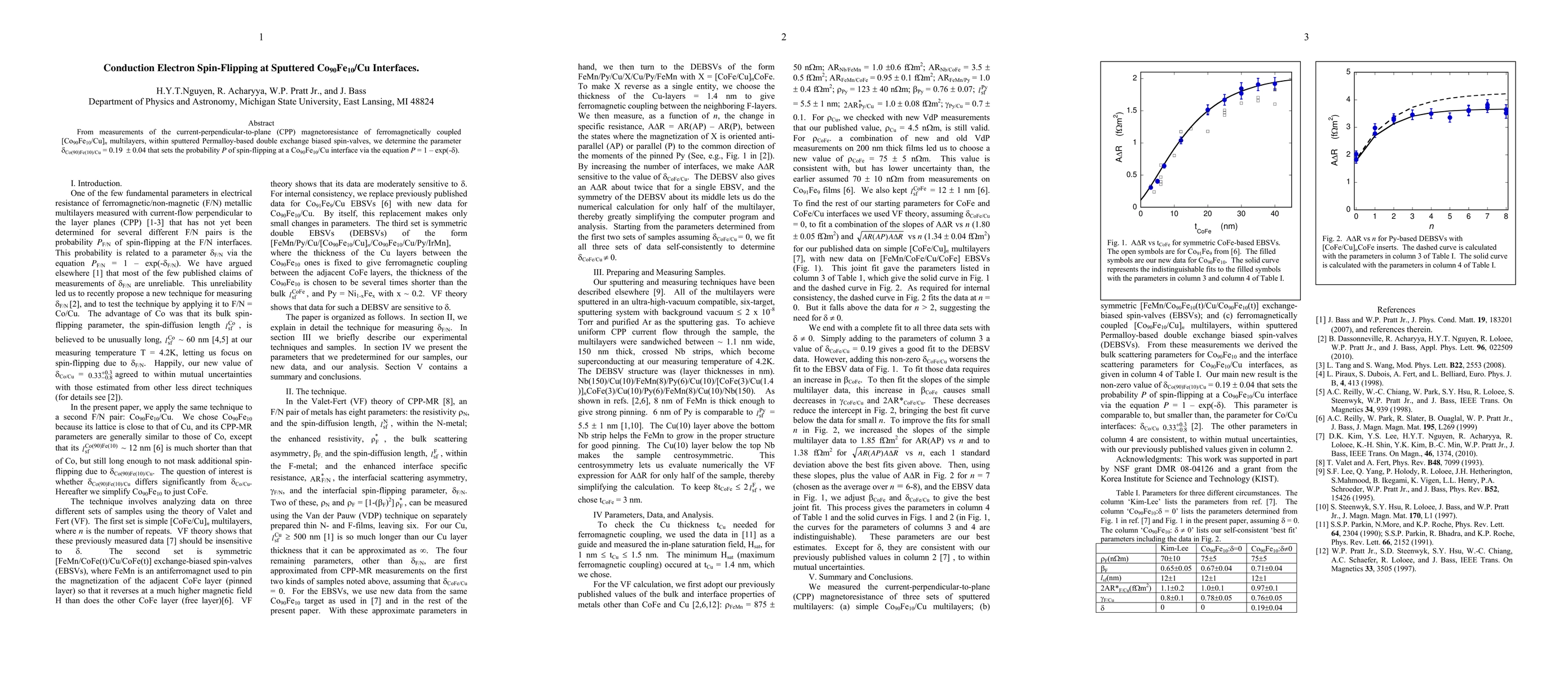 The paper presents a novel technique for measuring the interfacial spin-flipping parameter (δ) at Co90Fe10/Cu interfaces using CPP-MR measurements and Valet-Fert theory.