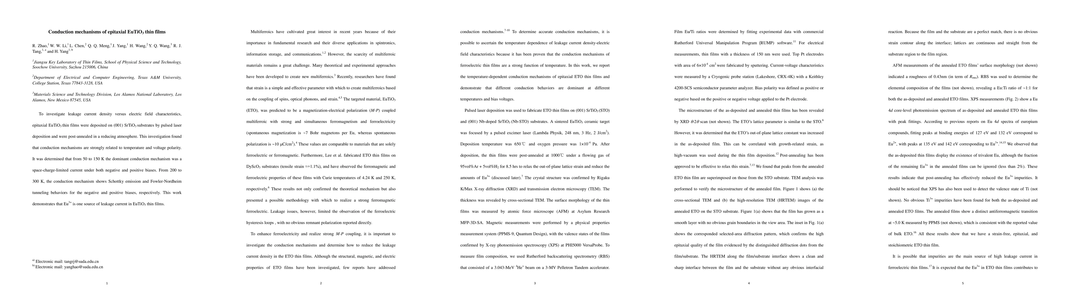 This study explores the conduction mechanisms in epitaxial EuTiO3 thin films deposited on SrTiO3 substrates, revealing that space-charge-limited current dominates at low temperatures (50-150 K) and Schottky emission and Fowler-Nordheim tunneling occur at higher temperatures (200-300 K). Eu3+ ions are identified as a source of leakage current.