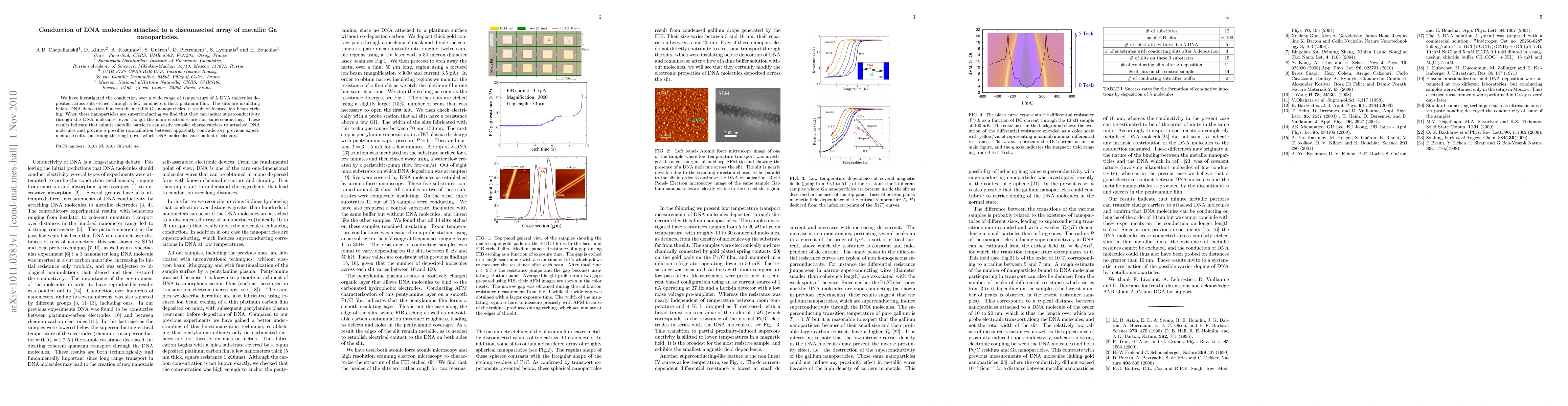 This research demonstrates that metallic Ga nanoparticles embedded in insulating slits can induce superconductivity in attached DNA molecules, resolving previous discrepancies regarding DNA's electrical conduction capabilities. Conduction is facilitated by the transfer of charge carriers from superconducting nanoparticles to DNA molecules.