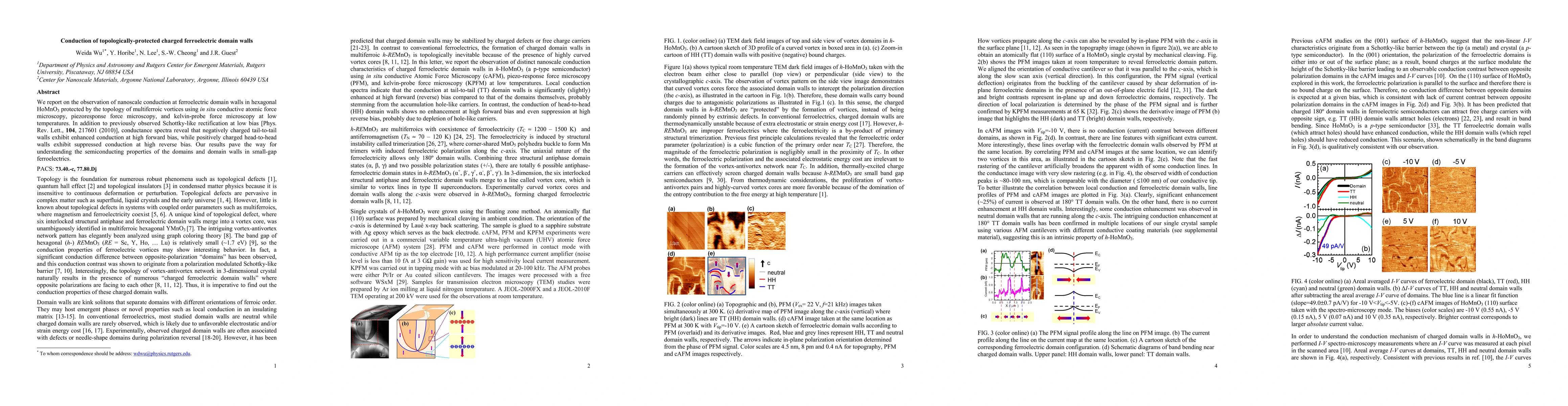 We report on the observation of nanoscale conduction at ferroelectric domain walls in hexagonal HoMnO3 protected by the topology of multiferroic vortices using in situ conductive atomic force microscopy, piezoresponse force microscopy, and kelvin-probe force microscopy at low temperatures. In addition to previously observed Schottky-like rectification at low bias [Phys. Rev. Lett., 104, 217601 (2010)], conductance spectra reveal that negatively charged tail-to-tail walls exhibit enhanced conduction at high forward bias, while positively charged head-to-head walls exhibit suppressed conduction at high reverse bias. Our results pave the way for understanding the semiconducting properties of the domains and domain walls in small-gap ferroelectrics.
