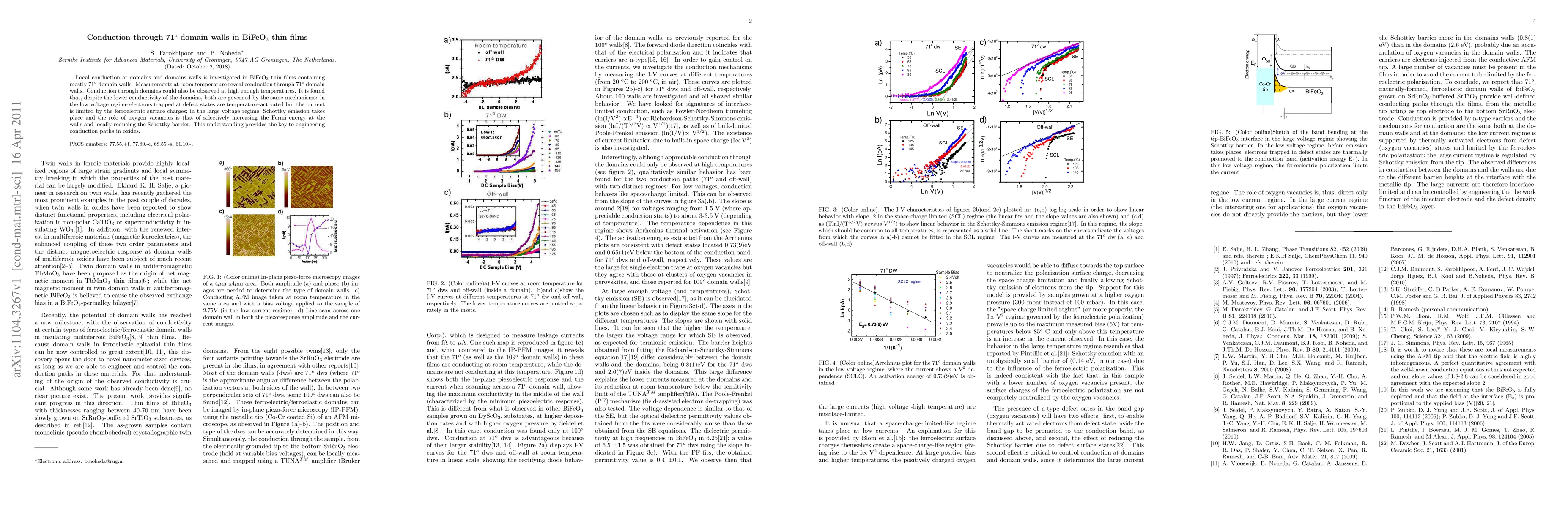 Summary: Research investigates conduction mechanisms in BiFeO3 thin films with 71° domain walls, revealing that both domains and walls conduct via temperature-activated electron trapping and Schottky emission, with oxygen vacancies influencing the Fermi energy and Schottky barrier at the walls. This insight aids in engineering conduction pathways in oxide materials.