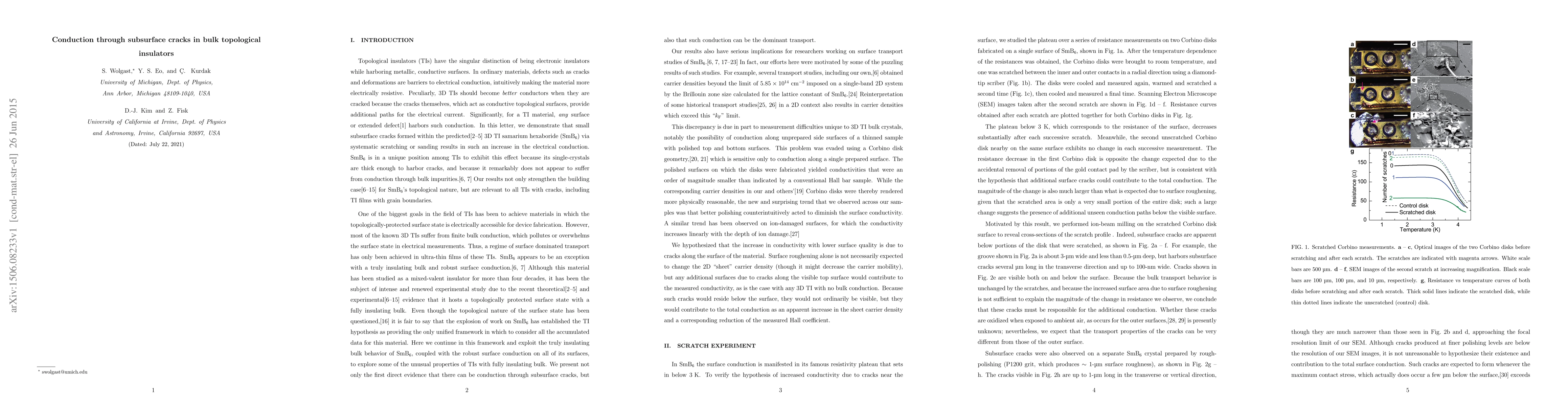 Topological insulators (TIs) have the singular distinction of being electronic insulators while harboring metallic, conductive surfaces. In ordinary materials, defects such as cracks and deformations are barriers to electrical conduction, intuitively making the material more electrically resistive. Peculiarly, 3D TIs should become better conductors when they are cracked because the cracks themselves, which act as conductive topological surfaces, provide additional paths for the electrical current. Significantly, for a TI material, any surface or extended defect harbors such conduction. In this letter, we demonstrate that small subsurface cracks formed within the predicted 3D TI samarium hexaboride (SmB$_{6}$) via systematic scratching or sanding results in such an increase in the electrical conduction. SmB$_{6}$ is in a unique position among TIs to exhibit this effect because its single-crystals are thick enough to harbor cracks, and because it remarkably does not appear to suffer from conduction through bulk impurities. Our results not only strengthen the building case for SmB$_{6}$'s topological nature, but are relevant to all TIs with cracks, including TI films with grain boundaries.