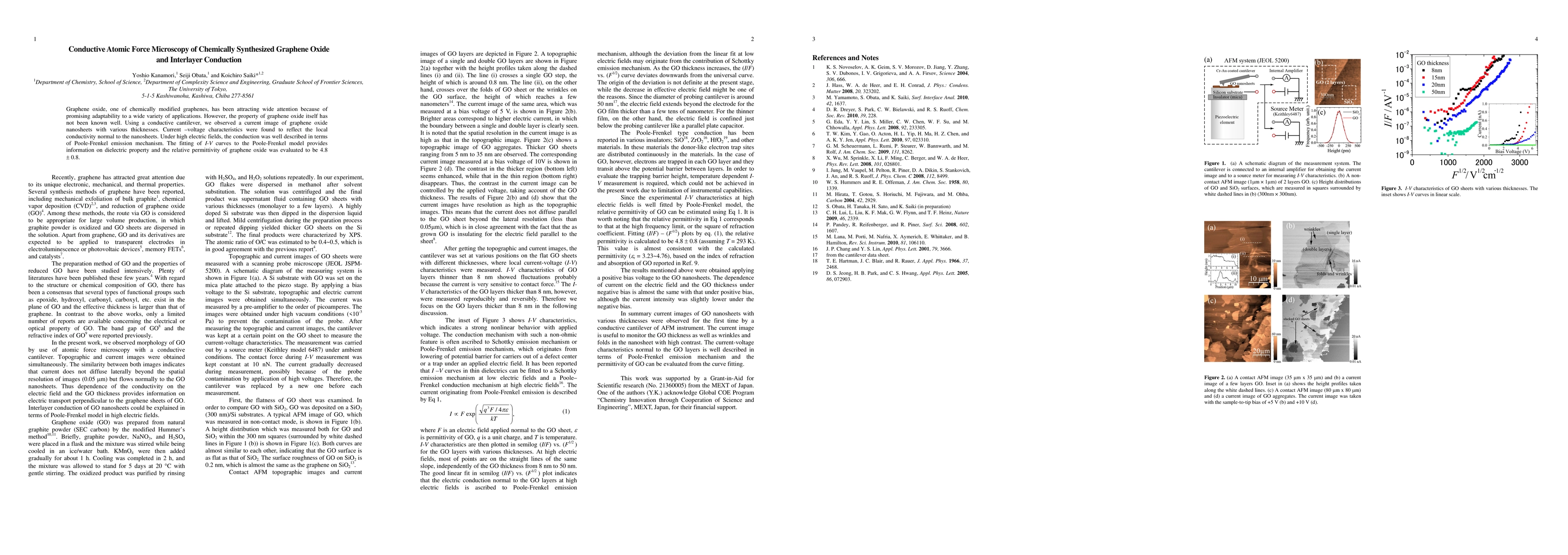 Graphene oxide (GO) is one of chemically modified graphenes and has been extensively investigated worldwide. A monolayer sheet of GO can be chemically produced in solution and it has been expected to be adaptable to a wide variety of applications. Most of works have focused on fabrication and reduction processes of GO, while its intrinsic property has not been explored in detail. We have succeeded in fabricating large scale GO nanosheets reproducibly. In the present work, we observed GO nanosheets by conductive atomic force microscopy. The current image is useful to monitor the GO thickness as well as wrinkles and folds in the nanosheet with high contrast. In addition to the current images, local I-V characteristics of the GO sheet were measured with the conductive cantilever. Based on the applied electric filed dependence, the conduction normal to the GO sheet could be described in terms of Poole Frenkel emission mechanism and the relative permittivity of GO is evaluated to be 4.8.