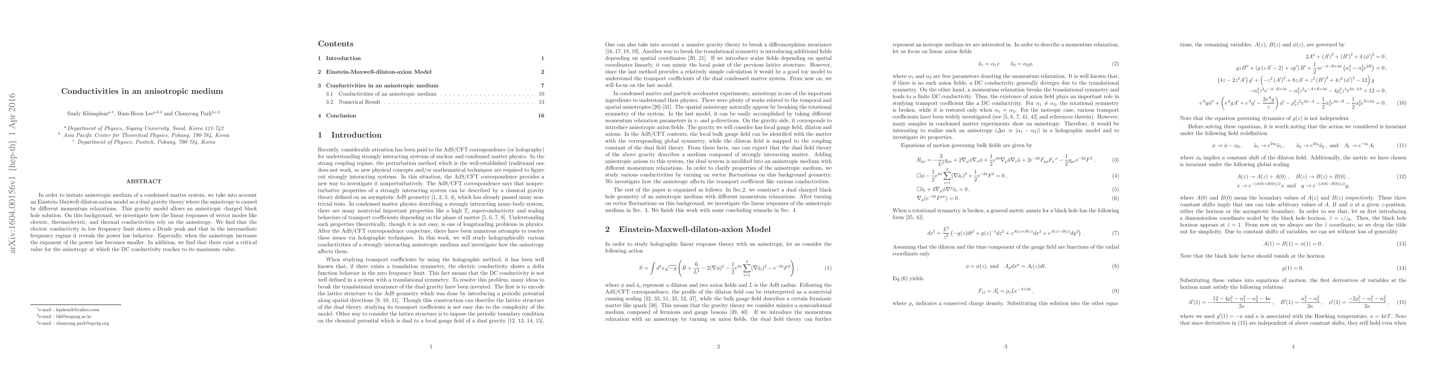 This paper explores conductivities in an anisotropic medium using an Einstein-Maxwell-dilaton-axion model, revealing that electric conductivity exhibits a Drude peak at low frequencies and a power law behavior at intermediate frequencies, with the exponent decreasing as anisotropy increases. The study also identifies a critical anisotropy level for maximum DC conductivity.