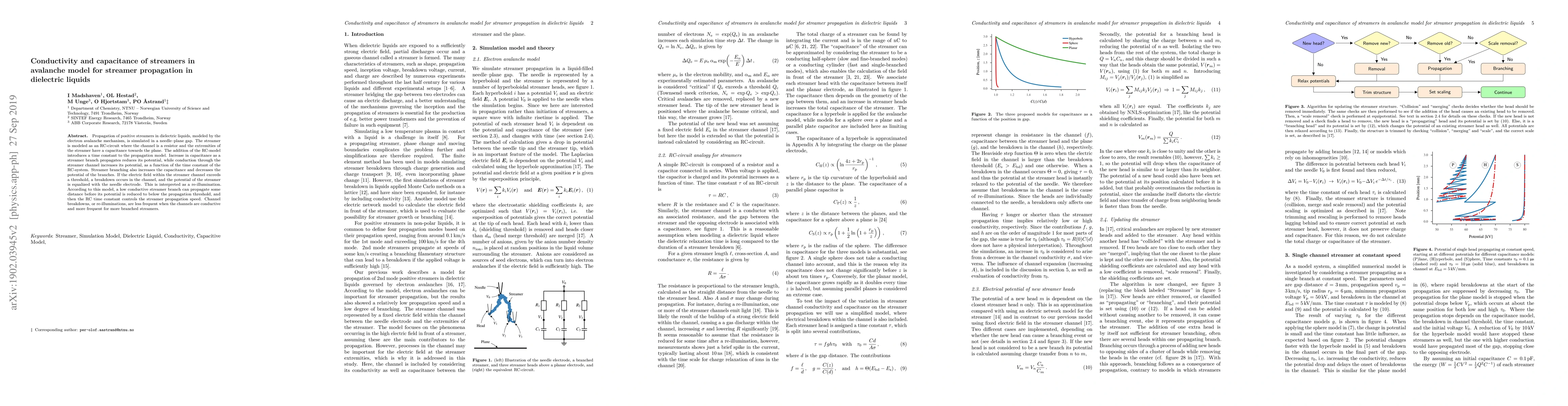 This paper investigates the conductivity and capacitance of positive streamers in dielectric liquids using an electron avalanche model. It simulates streamer propagation in an RC-circuit model, showing that capacitance reduction and conduction increase streamer potential, while branching increases capacitance and decreases potential, influencing propagation speed and breakdown frequency.