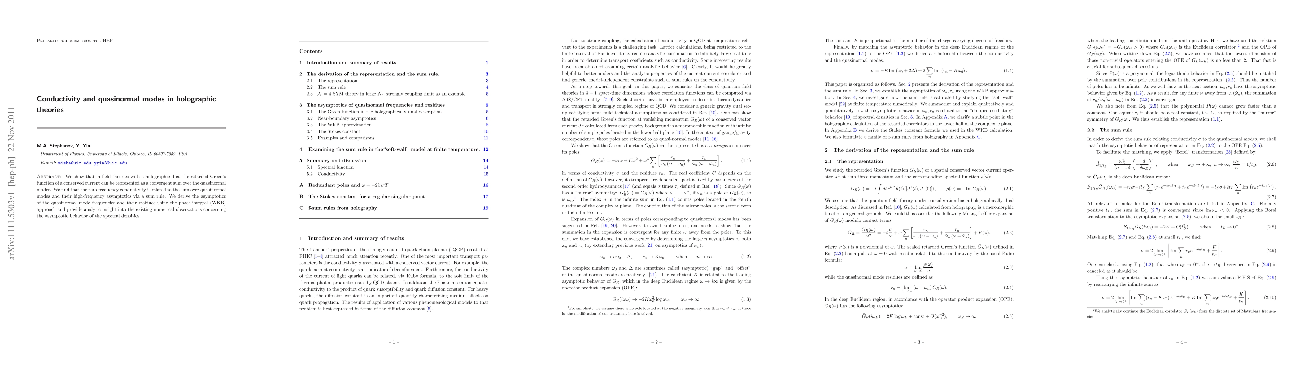 We show that in field theories with a holographic dual the retarded Green's function of a conserved current can be represented as a convergent sum over the quasinormal modes. We find that the zero-frequency conductivity is related to the sum over quasinormal modes and their high-frequency asymptotics via a sum rule. We derive the asymptotics of the quasinormal mode frequencies and their residues using the phase-integral (WKB) approach and provide analytic insight into the existing numerical observations concerning the asymptotic behavior of the spectral densities.