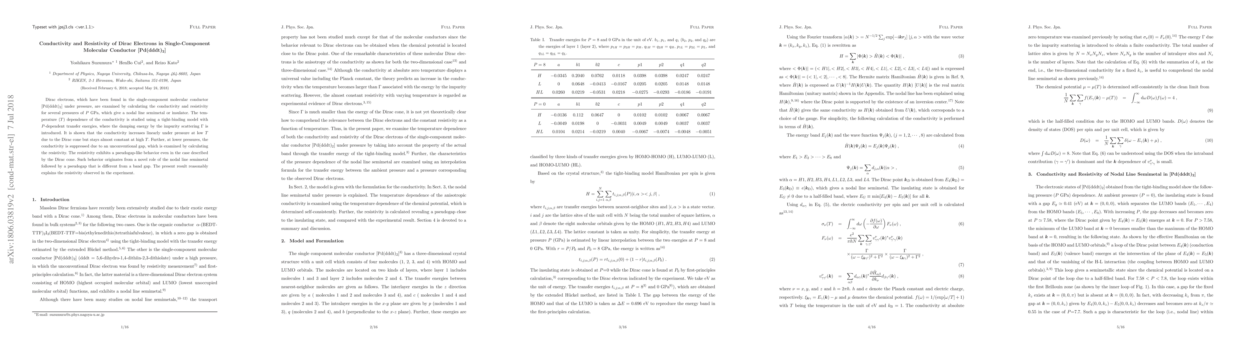 Dirac electrons, which have been found in the single-component molecular conductor [Pd(dddt)_2] under pressure, are examined by calculating the conductivity and resistivity in terms of a tight-binding model for several pressures of P GPa, which give a nodal line semimetal or insulator. The temperature (T) dependence of the conductivity shows that the conductivity increases linearly under pressure at low T due to the Dirac cone but stays almost constant at high T. Further, at lower pressures, the conductivity is suppressed due to an unconventional gap, which is examined by calculating the resistivity. The resistivity exhibits a pseudogap-like behavior even in the case described by the Dirac cone. Such behavior originates from a novel role of the nodal line semimetal followed by a pseudogap that is different from a band gap. The present result reasonably explains the resistivity observed in the experiment.