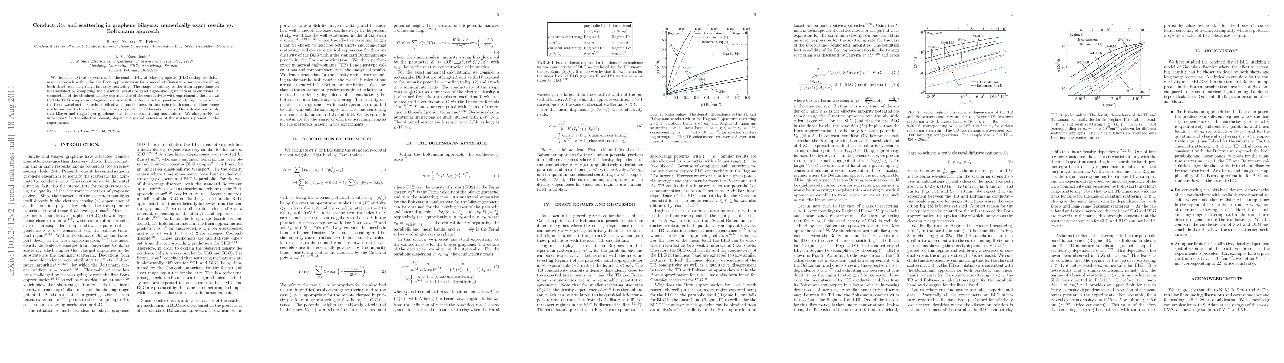 We derive analytical expressions for the conductivity of bilayer graphene (BLG) using the Boltzmann approach within the the Born approximation for a model of Gaussian disorders describing both short- and long-range impurity scattering. The range of validity of the Born approximation is established by comparing the analytical results to exact tight-binding numerical calculations. A comparison of the obtained density dependencies of the conductivity with experimental data shows that the BLG samples investigated experimentally so far are in the quantum scattering regime where the Fermi wavelength exceeds the effective impurity range. In this regime both short- and long-range scattering lead to the same linear density dependence of the conductivity. Our calculations imply that bilayer and single layer graphene have the same scattering mechanisms. We also provide an upper limit for the effective, density dependent spatial extension of the scatterers present in the experiments.
