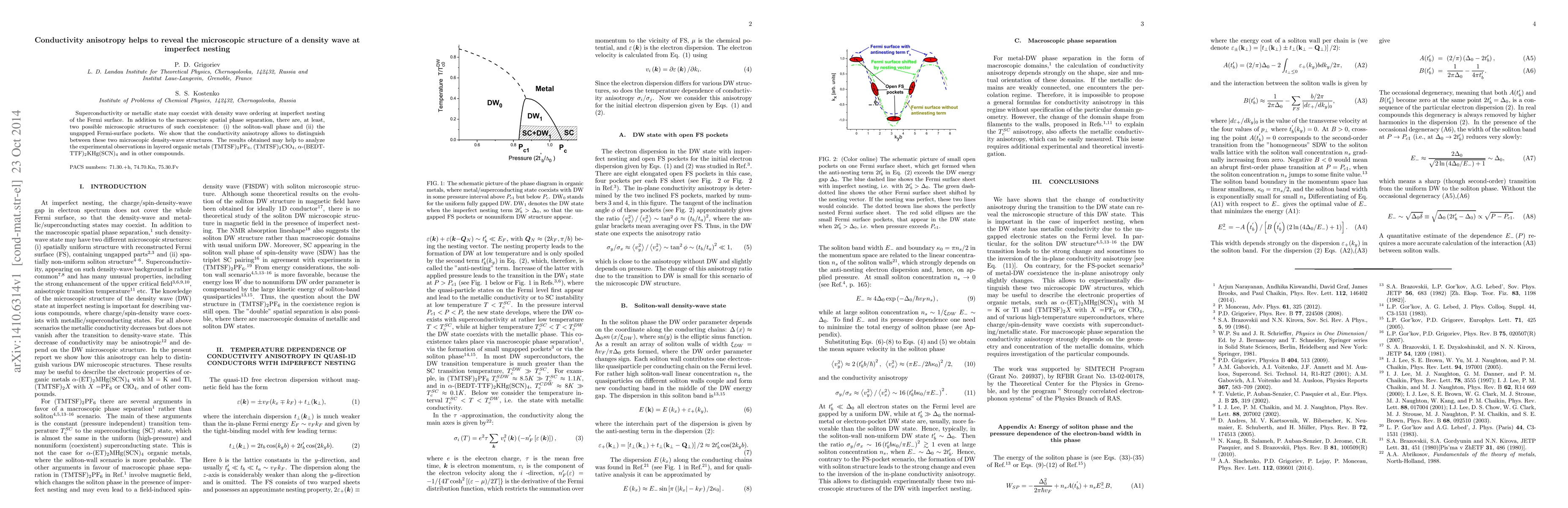 Superconductivity or metallic state may coexist with density wave ordering at imperfect nesting of the Fermi surface. In addition to the macroscopic spatial phase separation, there are, at least, two possible microscopic structures of such coexistence: (i) the soliton-wall phase and (ii) the ungapped Fermi-surface pockets. We show that the conductivity anisotropy allows to distinguish between these two microscopic density-wave structures. The results obtained may help to analyze the experimental observations in layered organic metals (TMTSF)$_{2}$PF$_{6}$, (TMTSF)$_{2}$ClO$_{4}$, $\alpha $-(BEDT-TTF)$_{2}$KHg(SCN)$_{4}$ and in other compounds.
