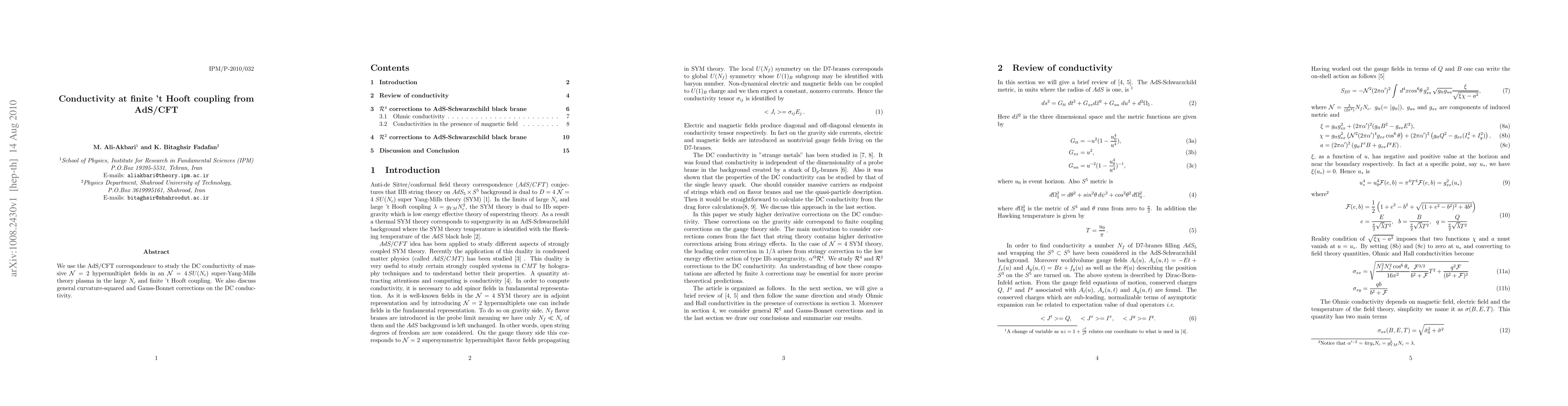 We use the AdS/CFT correspondence to study the DC conductivity of massive $\mathcal{N} = 2$ hypermultiplet fields in an $\mathcal{N} = 4\, SU(N_c)$ super-Yang-Mills theory plasma in the large $N_c$ and finite 't Hooft coupling. We also discuss general curvature-squared and Gauss-Bonnet corrections on the DC conductivity.