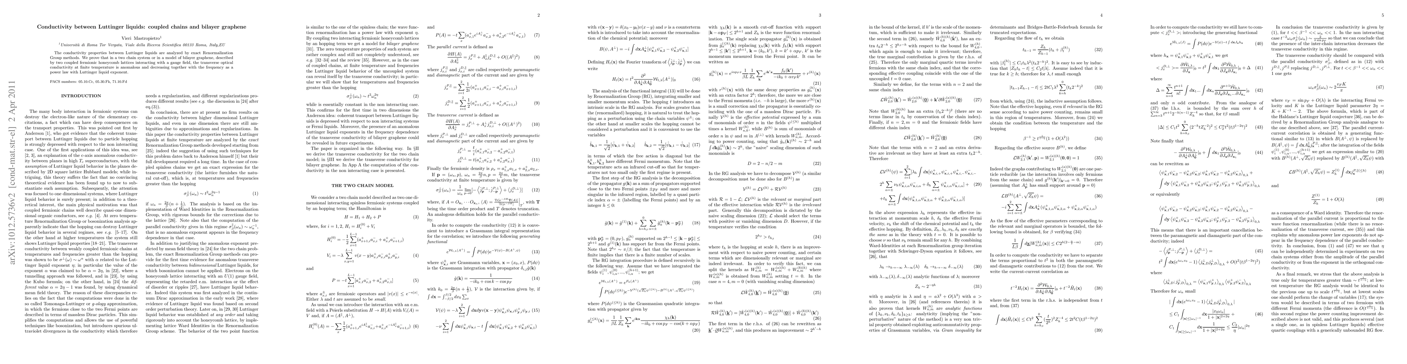 Summary: This paper uses exact Renormalization Group methods to analyze conductivity between Luttinger liquids in coupled chain systems and bilayer graphene, finding that the transverse optical conductivity decreases anomalously with frequency at finite temperatures, following a power law with a Luttinger liquid exponent.