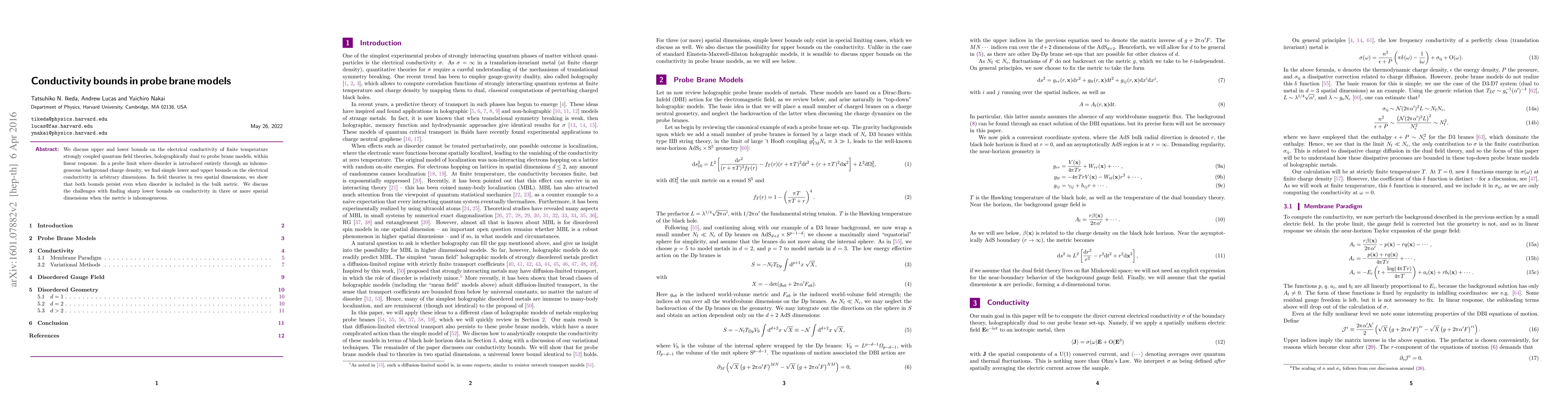 We discuss upper and lower bounds on the electrical conductivity of finite temperature strongly coupled quantum field theories, holographically dual to probe brane models, within linear response. In a probe limit where disorder is introduced entirely through an inhomogeneous background charge density, we find simple lower and upper bounds on the electrical conductivity in arbitrary dimensions. In field theories in two spatial dimensions, we show that both bounds persist even when disorder is included in the bulk metric. We discuss the challenges with finding sharp lower bounds on conductivity in three or more spatial dimensions when the metric is inhomogeneous.