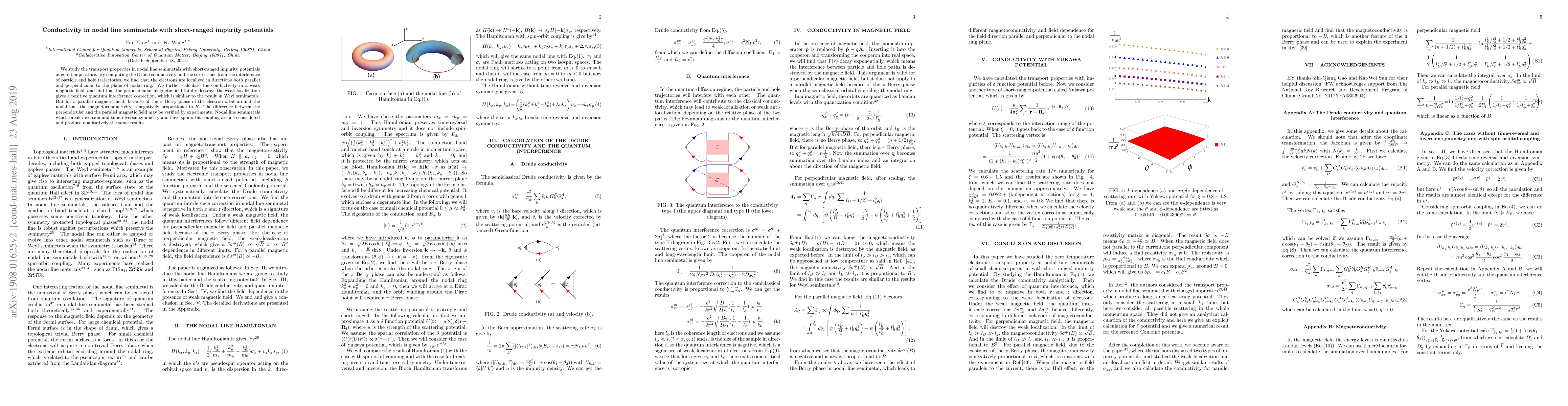 This study investigates the conductivity and transport properties in nodal line semimetals with short-ranged impurities, finding electron localization in both parallel and perpendicular directions. Under a perpendicular magnetic field, weak localization is destroyed, while a parallel magnetic field results in negative magnetoconductivity due to the π Berry phase.