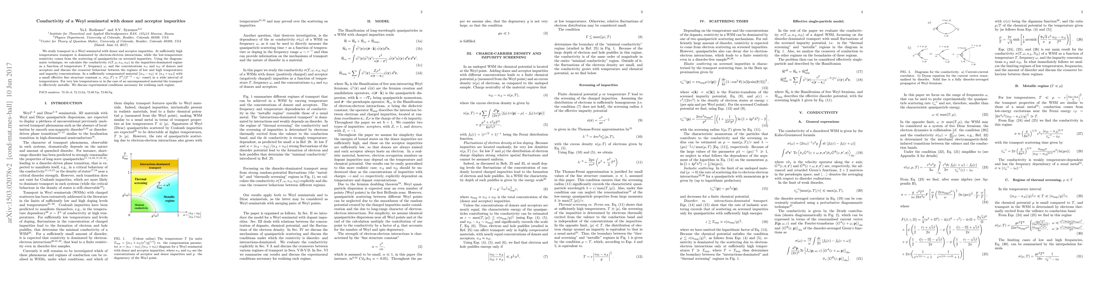 This paper investigates the conductivity of a Weyl semimetal with donor and acceptor impurities, focusing on the transition between electron-electron interaction-dominated transport at high temperatures and impurity scattering-dominated resistivity at low temperatures. The study reveals a metallic transport regime at very low temperatures or in uncompensated materials.
