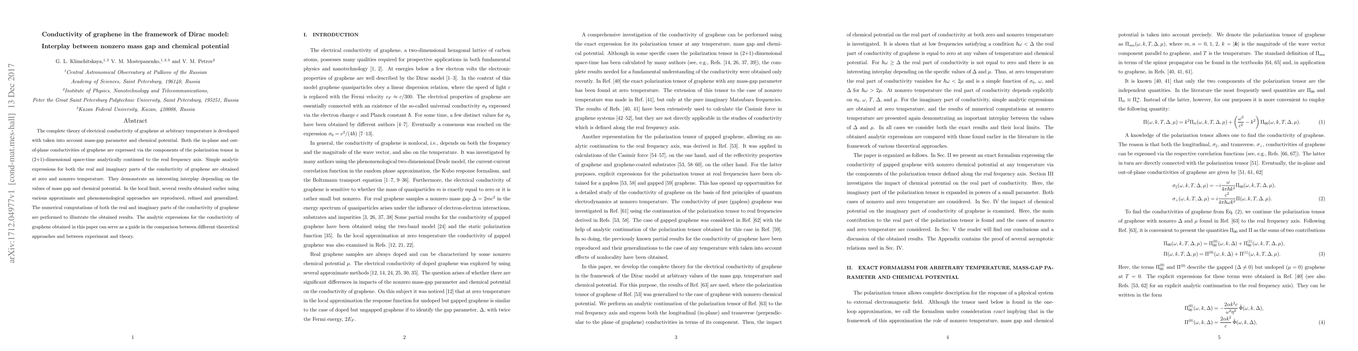 Researchers develop a complete theory for graphene conductivity that considers mass-gap parameter and chemical potential, providing analytical expressions for real and imaginary parts of conductivity at zero and nonzero temperature.