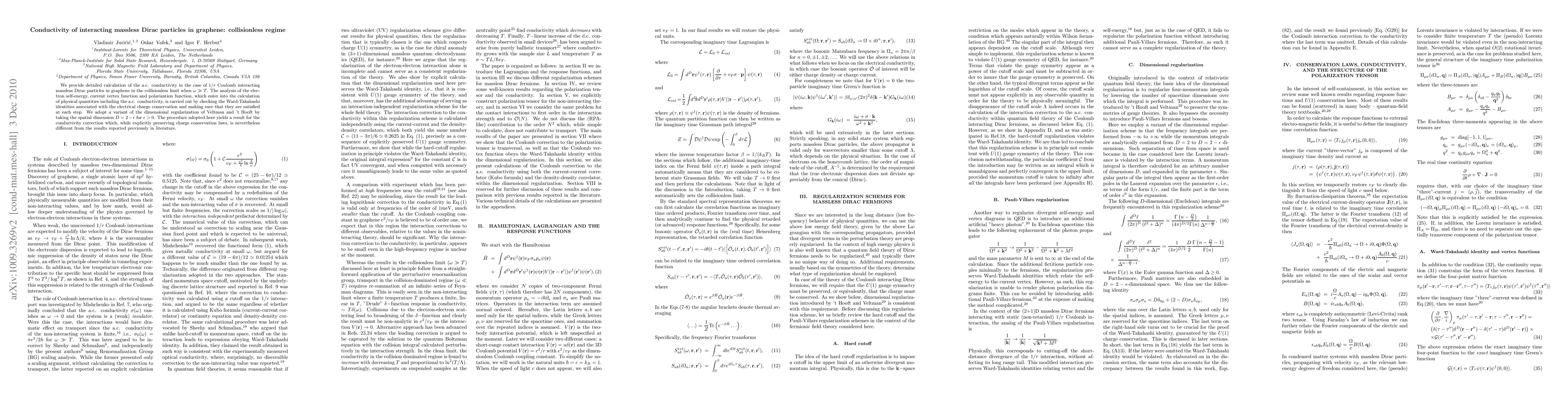 Researchers calculated the conductivity of massless Dirac particles in graphene with Coulomb interactions, finding a result that preserves charge conservation laws but differs from previous literature.