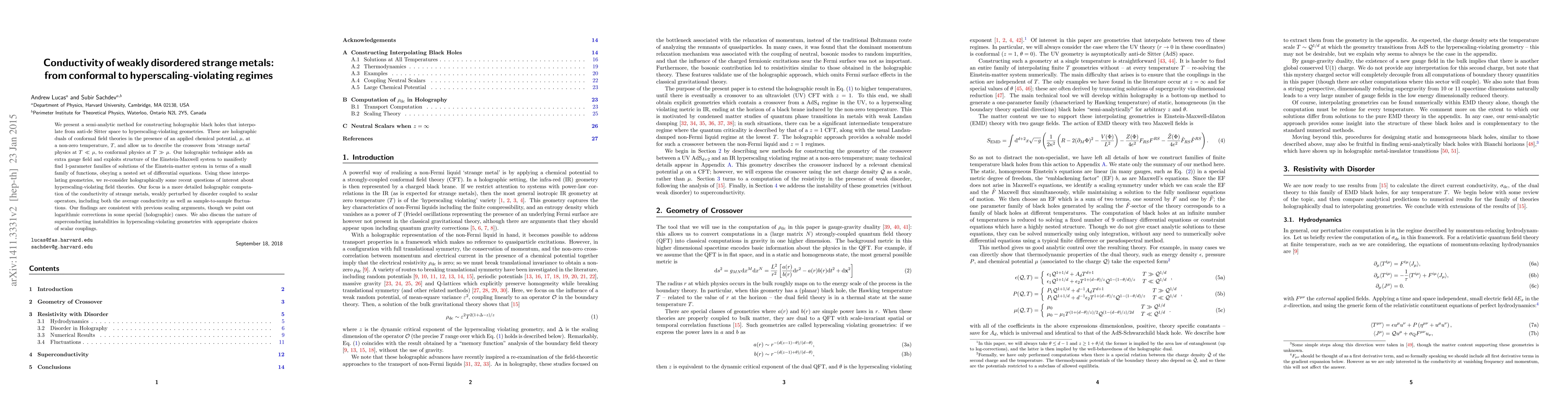This paper develops a semi-analytic method for constructing holographic black holes that model strange metals transitioning from conformal to hyperscaling-violating regimes. It computes the conductivity and fluctuations in weakly disordered strange metals, finding logarithmic corrections and discussing superconducting instabilities.