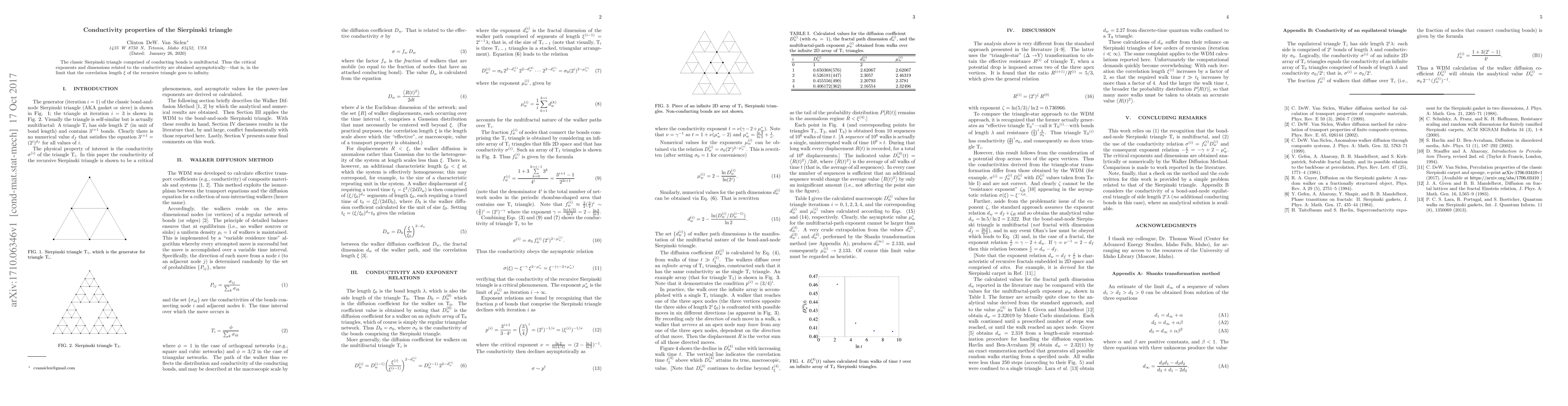 The Sierpinski triangle with conducting bonds exhibits multifractal properties, and its critical exponents and dimensions related to conductivity are determined asymptotically as the correlation length approaches infinity. This analysis highlights the fractal nature of the triangle's conductivity behavior.