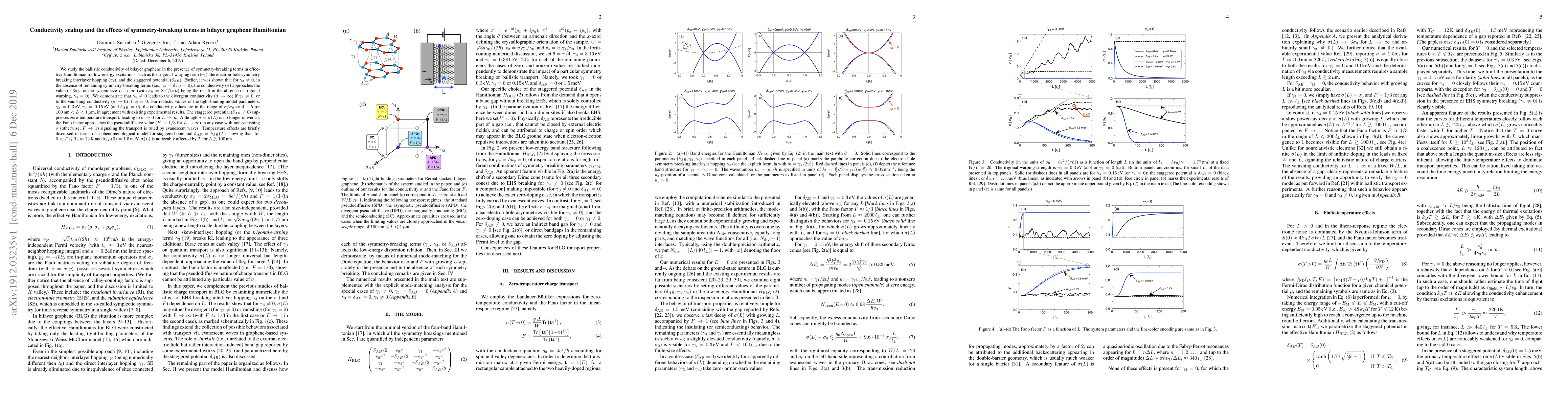 Researchers studied conductivity in bilayer graphene with symmetry-breaking terms, finding that certain conditions lead to divergent or vanishing conductivity, while others affect transport at low temperatures.
