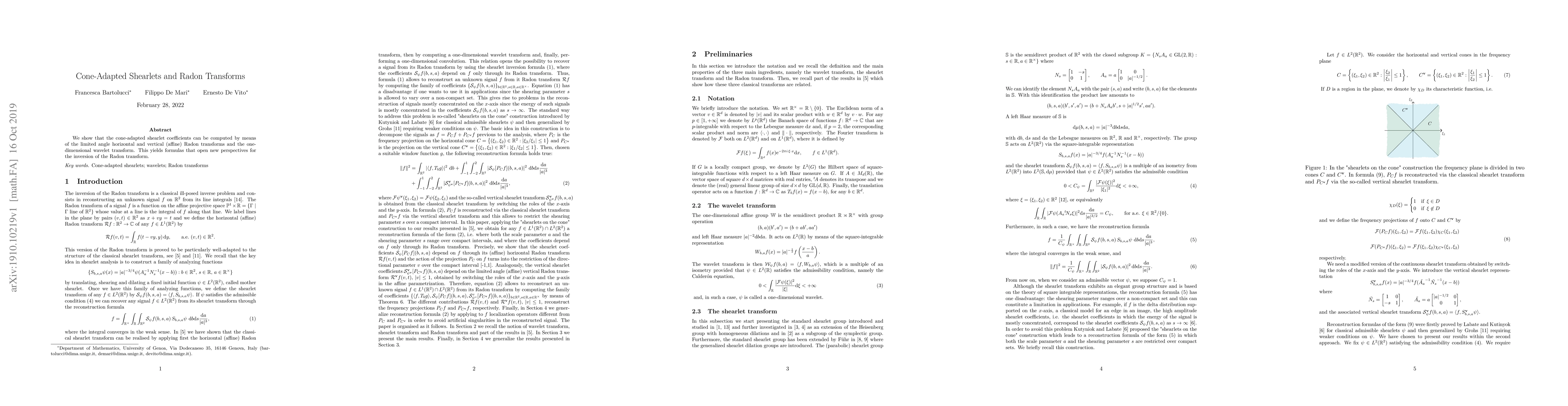 Summary: This paper demonstrates how cone-adapted shearlet coefficients can be calculated using limited angle horizontal and vertical Radon transforms along with one-dimensional wavelet transforms, providing new methods for Radon transform inversion.
