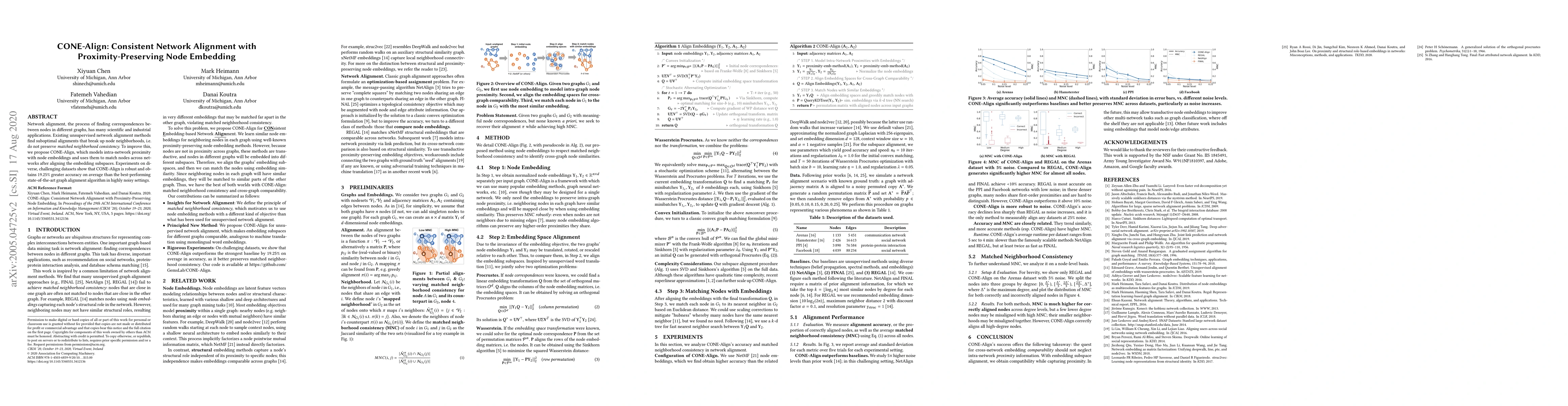 A new method called CONE-Align improves network alignment accuracy by modeling node proximity with embeddings and preserving matched neighborhood consistency. It outperforms the best state-of-the-art algorithm in noisy settings by 19.25% on average.
