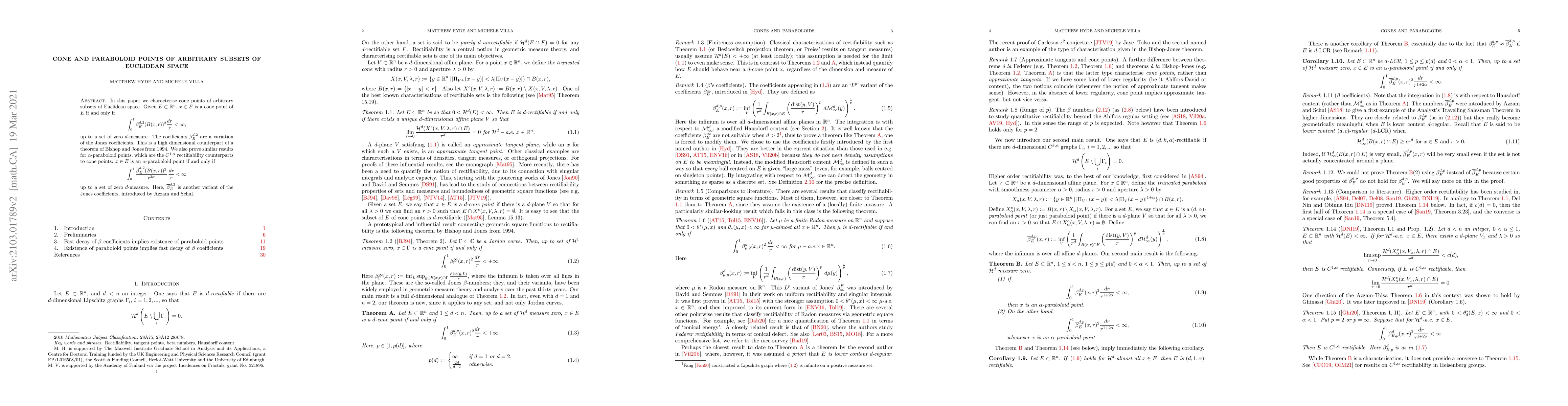 In this paper we characterise cone points of arbitrary subsets of Euclidean space. Given $E \subset \mathbb{R}^n$, $x \in E$ is a cone point of $E$ if and only if \begin{align*} \int_{0}^1 \beta_{E}^{d,2}(B(x,r))^2 \frac{dr}{r} < \infty, \end{align*} up to a set of zero $d$-measure. The coefficients $\beta_E^{d,2}$ are a variation of the Jones coefficients. This is a high dimensional counterpart of a theorem of Bishop and Jones from 1994. We also prove similar results for $\alpha$-paraboloid points, which are the $C^{1,\alpha}$ rectifiability counterparts to cone points: $x \in E$ is an $\alpha$-paraboloid point if and only if \begin{align*} \int_0^1 \frac{\overline{\beta}_{E}^{d,2}(B(x,r))^2}{r^{2\alpha}} \, \frac{dr}{r} < \infty \end{align*} up to a set of zero $d$-measure. Here, $\overline{\beta}^{d,2}_E$ is another variant of the Jones coefficients, introduced by Azzam and Schul.
