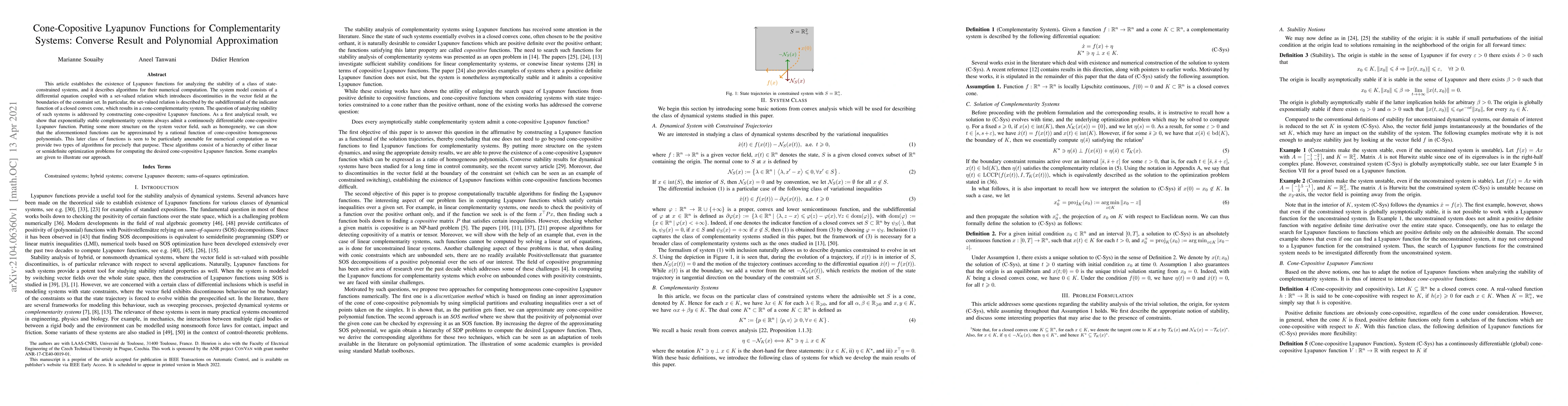 This article establishes the existence of Lyapunov functions for analyzing the stability of a class of state-constrained systems, and it describes algorithms for their numerical computation. The system model consists of a differential equation coupled with a set-valued relation which introduces discontinuities in the vector field at the boundaries of the constraint set. In particular, the set-valued relation is described by the subdifferential of the indicator function of a closed convex cone, which results in a cone-complementarity system. The question of analyzing stability of such systems is addressed by constructing cone-copositive Lyapunov functions. As a first analytical result, we show that exponentially stable complementarity systems always admit a continuously differentiable cone-copositive Lyapunov function. Putting some more structure on the system vector field, such as homogeneity, we can show that the aforementioned functions can be approximated by a rational function of cone-copositive homogeneous polynomials. This later class of functions is seen to be particularly amenable for numerical computation as we provide two types of algorithms for precisely that purpose. These algorithms consist of a hierarchy of either linear or semidefinite optimization problems for computing the desired cone-copositive Lyapunov function. Some examples are given to illustrate our approach.