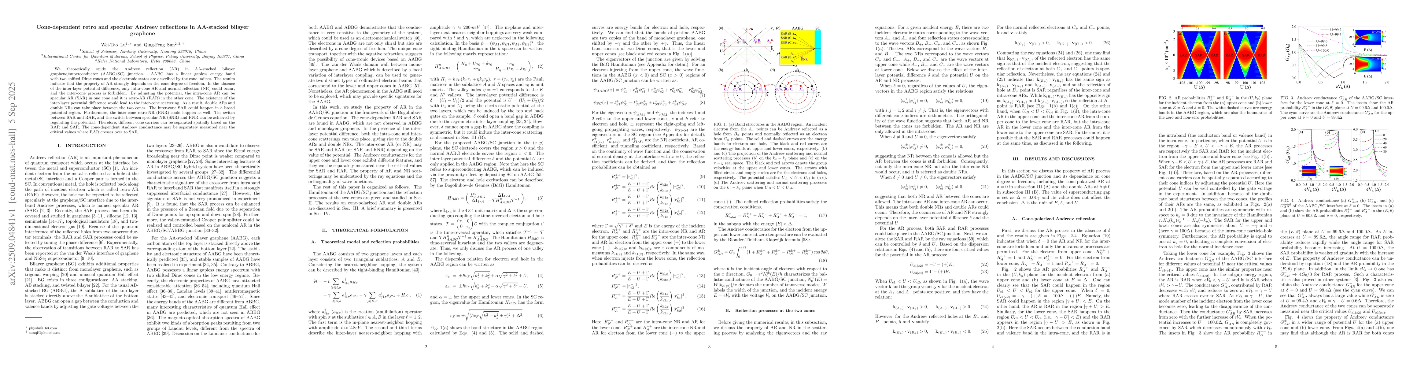 We theoretically study the Andreev reflection (AR) in AA-stacked bilayer graphene/superconductor (AABG/SC) junction. AABG has a linear gapless energy band with two shifted Dirac cones and the electronic states are described by the cone indices. The results indicate that the property of AR strongly depends on the cone degree of freedom. In the absence of the inter-layer potential difference, only intra-cone AR and normal reflection (NR) could occur, and the inter-cone process is forbidden. By adjusting the potential, the intra-cone AR can be specular AR (SAR) in one cone and it is retro-AR (RAR) in the other cone. The existence of the inter-layer potential difference would lead to the inter-cone scattering. As a result, double ARs and double NRs can take place between the two cones. The inter-cone SAR could happen in a broad potential region. Furthermore, the inter-cone retro-NR (RNR) could happen as well. The switch between SAR and RAR, and the switch between specular NR (SNR) and RNR can be achieved by regulating the potential. Therefore, different cone carriers can be separated spatially based on the RAR and SAR. The cone-dependent Andreev conductance may be separately measured near the critical values where RAR crosses over to SAR.