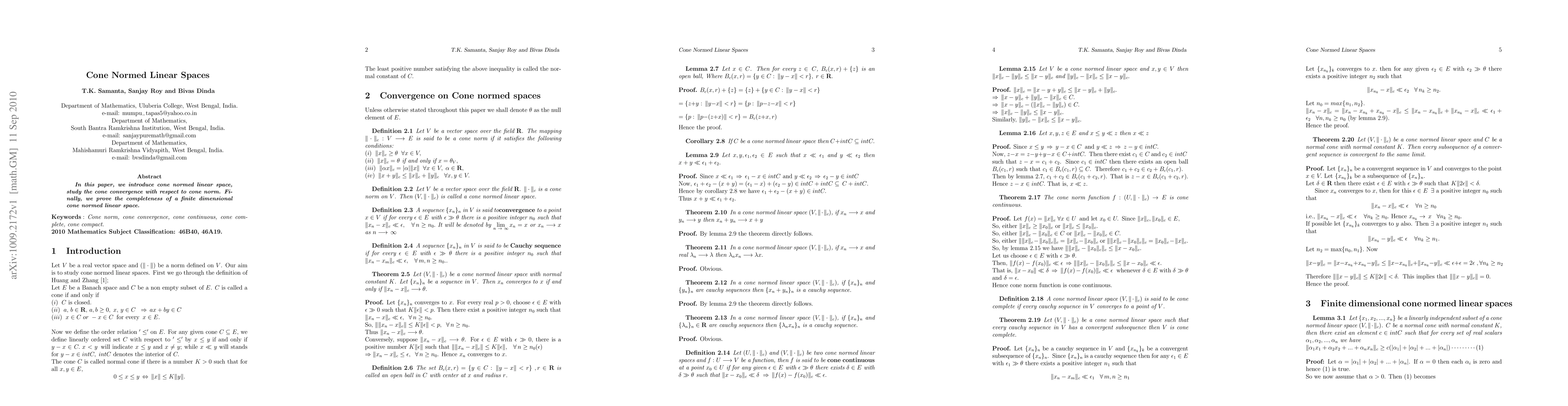 In this paper, we introduce cone normed linear space, study the cone convergence with respect to cone norm. Finally, we prove the completeness of a finite dimensional cone normed linear space.