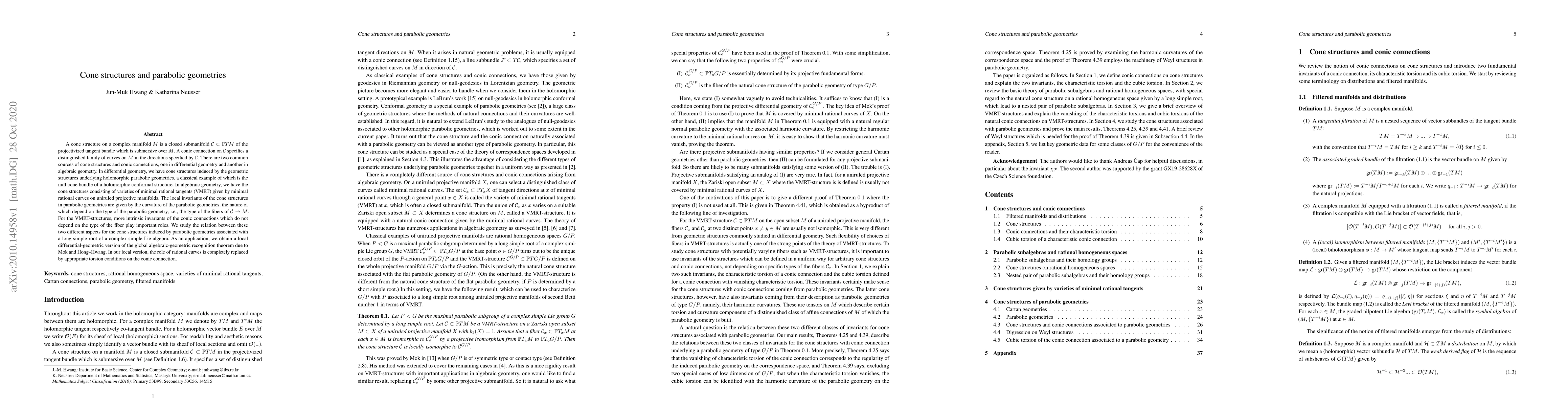 The paper presents a detailed analysis of the relationship between cone structures and parabolic geometries, introducing a local version of Mok and Hong--Hwang's recognition theorem.