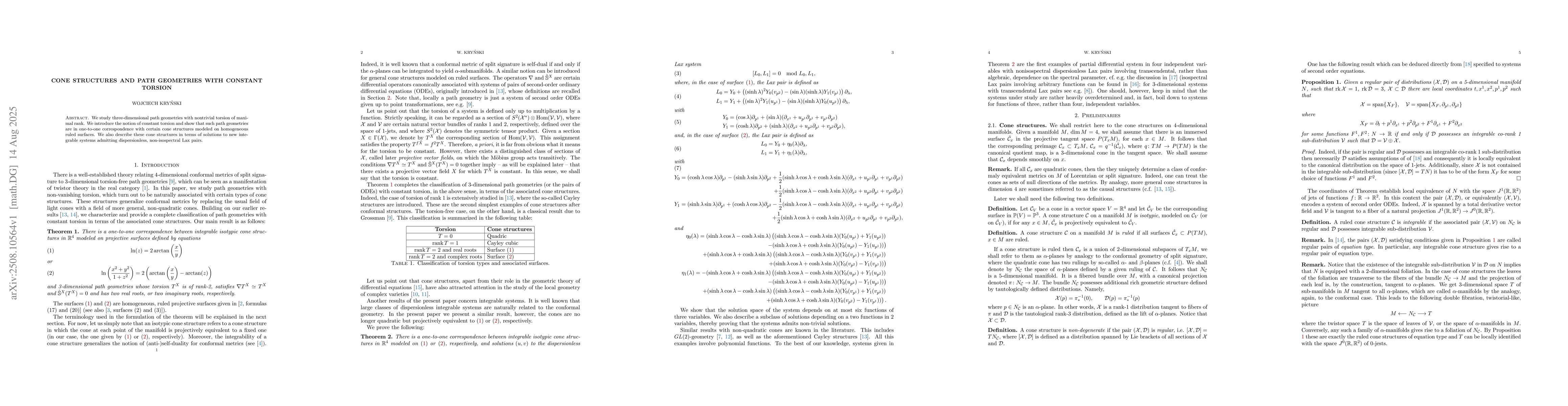 We study three-dimensional path geometries with nontrivial torsion of maximal rank. We introduce the notion of constant torsion and show that such path geometries are in one-to-one correspondence with certain cone structures modeled on homogeneous ruled surfaces. We also describe these cone structures in terms of solutions to new integrable systems admitting dispersionless, non-isospectral Lax pairs.
