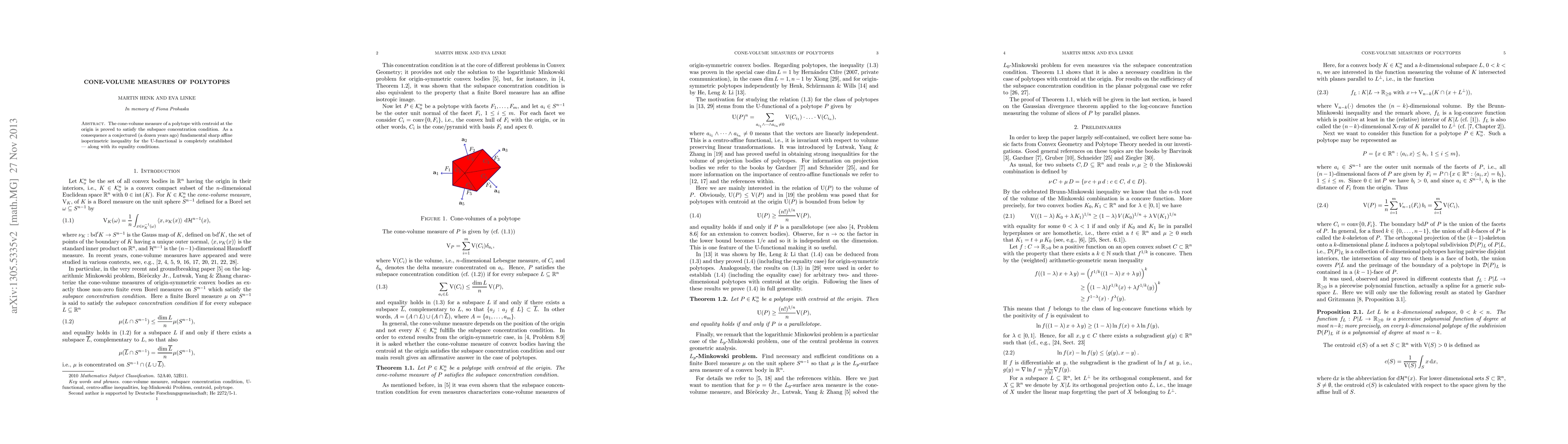 The cone-volume measure of a polytope with centroid at the origin is proved to satisfy the subspace concentration condition. As a consequence a conjectured (a dozen years ago) fundamental sharp affine isoperimetric inequality for the U-functional is completely established -- along with its equality conditions.