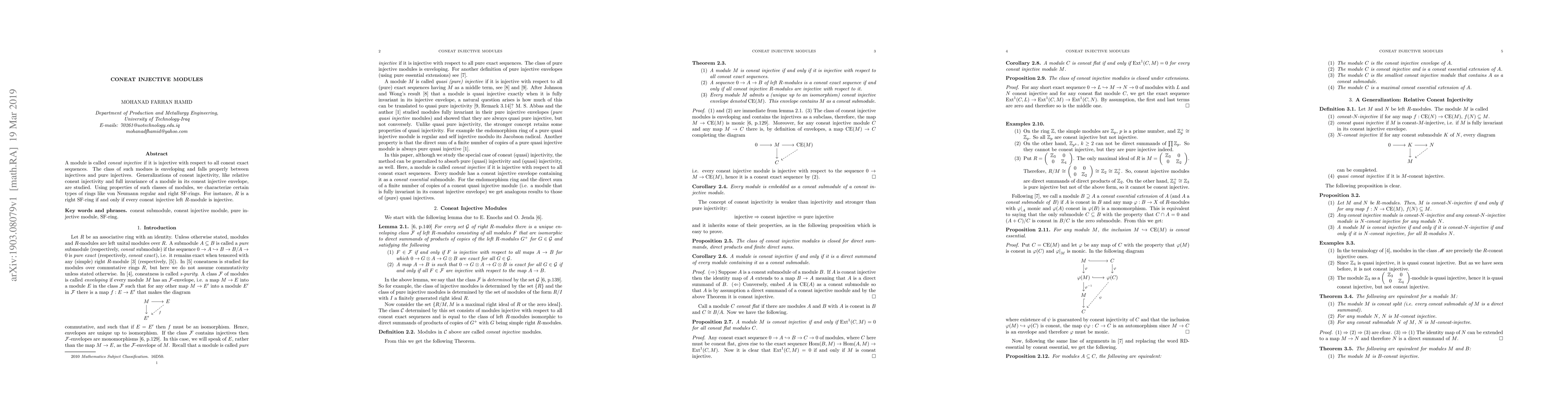 This paper explores coneat injective modules, which are injective with respect to coneat exact sequences, and situates them between injective and pure injective modules. It characterizes certain rings, such as von Neumann regular and right SF-rings, using properties of these modules, showing that a ring is a right SF-ring if every coneat injective left module is injective.