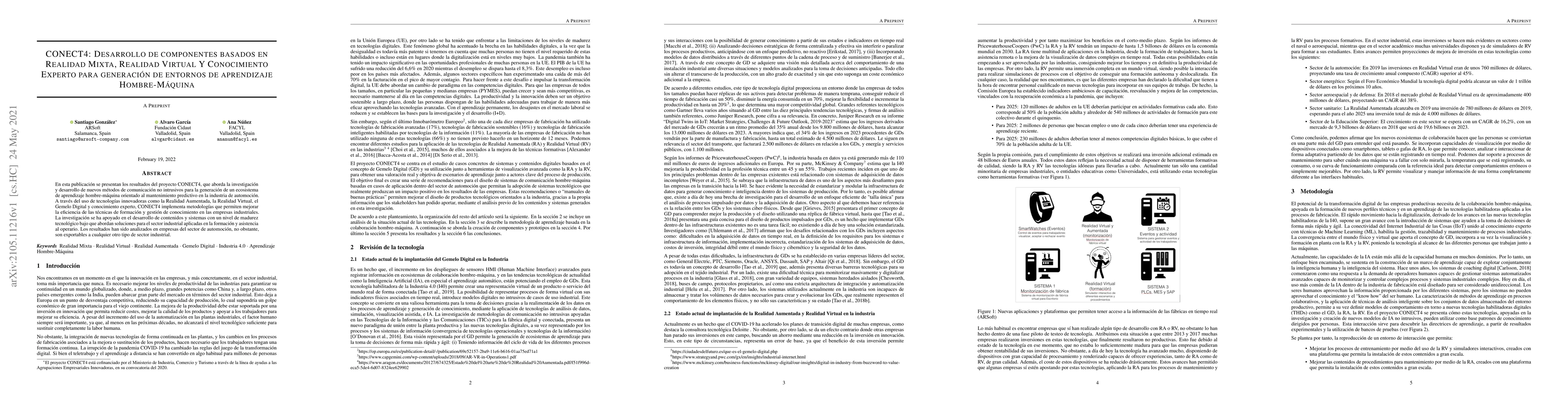 This work presents the results of project CONECT4, which addresses the research and development of new non-intrusive communication methods for the generation of a human-machine learning ecosystem oriented to predictive maintenance in the automotive industry. Through the use of innovative technologies such as Augmented Reality, Virtual Reality, Digital Twin and expert knowledge, CONECT4 implements methodologies that allow improving the efficiency of training techniques and knowledge management in industrial companies. The research has been supported by the development of content and systems with a low level of technological maturity that address solutions for the industrial sector applied in training and assistance to the operator. The results have been analyzed in companies in the automotive sector, however, they are exportable to any other type of industrial sector. -- -- En esta publicaci\'on se presentan los resultados del proyecto CONECT4, que aborda la investigaci\'on y desarrollo de nuevos m\'etodos de comunicaci\'on no intrusivos para la generaci\'on de un ecosistema de aprendizaje hombre-m\'aquina orientado al mantenimiento predictivo en la industria de automoci\'on. A trav\'es del uso de tecnolog\'ias innovadoras como la Realidad Aumentada, la Realidad Virtual, el Gemelo Digital y conocimiento experto, CONECT4 implementa metodolog\'ias que permiten mejorar la eficiencia de las t\'ecnicas de formaci\'on y gesti\'on de conocimiento en las empresas industriales. La investigaci\'on se ha apoyado en el desarrollo de contenidos y sistemas con un nivel de madurez tecnol\'ogico bajo que abordan soluciones para el sector industrial aplicadas en la formaci\'on y asistencia al operario. Los resultados han sido analizados en empresas del sector de automoci\'on, no obstante, son exportables a cualquier otro tipo de sector industrial.
